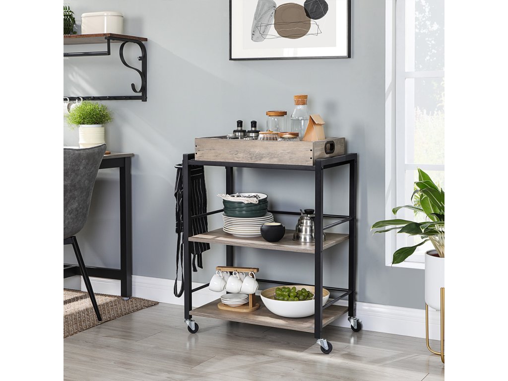 OBSLUHA 100: Pokud rádi překvapujete rodinu a přátele svými chutnými pokrmy, ale stůl není dostatečně velký. pak vám tento kuchyňský vozík se směsí romantické béžové a elegantní černé barvy pomůže prezentovat vaši laskavost a zanechá každého bez slov.V POHYBU NEBO NA MÍSTĚ? Záleží na vás! Můžete namontovat 4 kolečka - 2 z nich mají brzdy - a posunout kuchyňský vozík do obývacího pokoje. nebo pomocí nastavitelných nožiček stabilizovat kuchyňskou polici na nerovné podlaze.