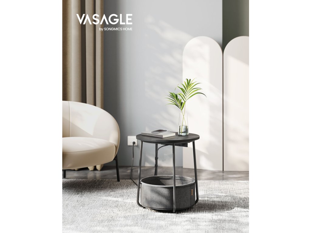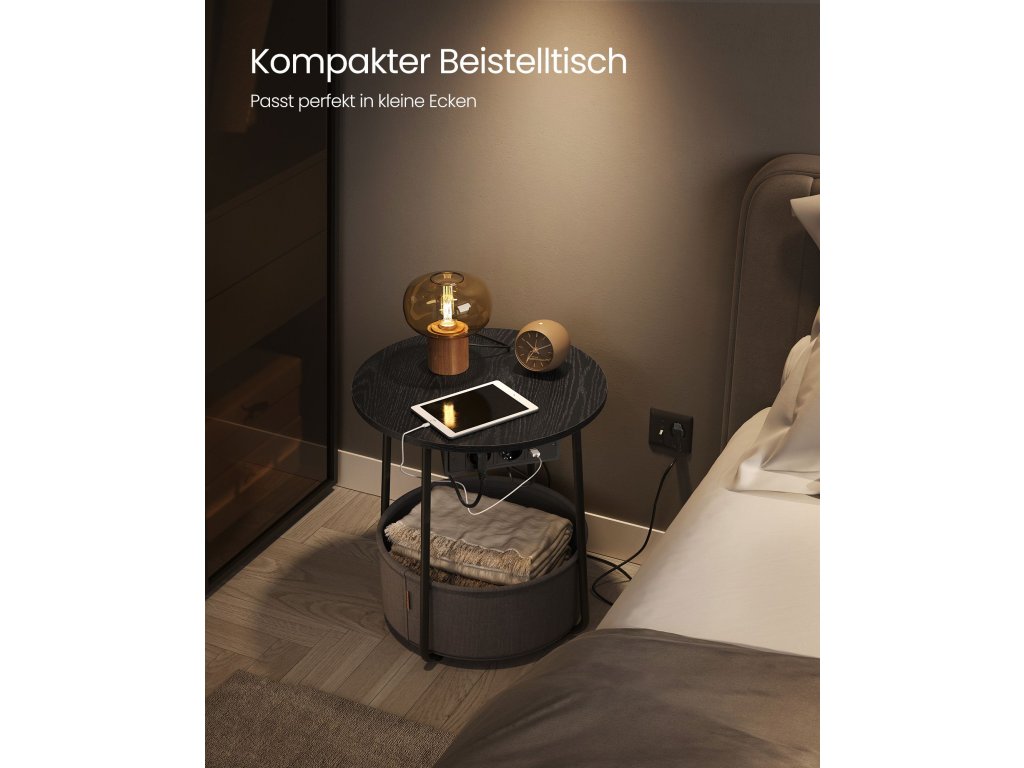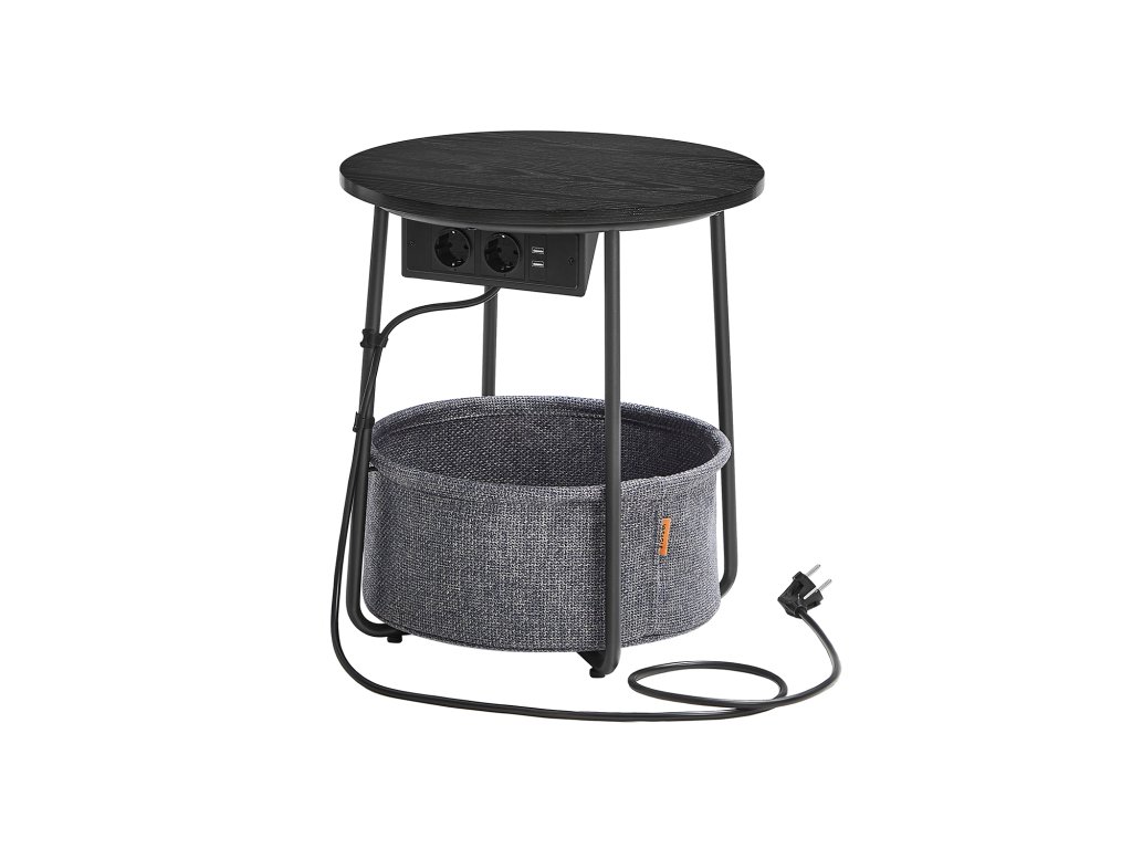 Kulatý odkládací stolek s nabíjecí stanicí, malý stolek se zásuvkou, konferenční stolek, USB porty, látkový košík, obývací pokoj ložnice, moderní noční stolek, ebenově černá - šedá.