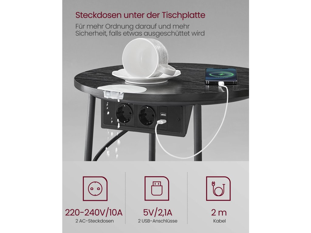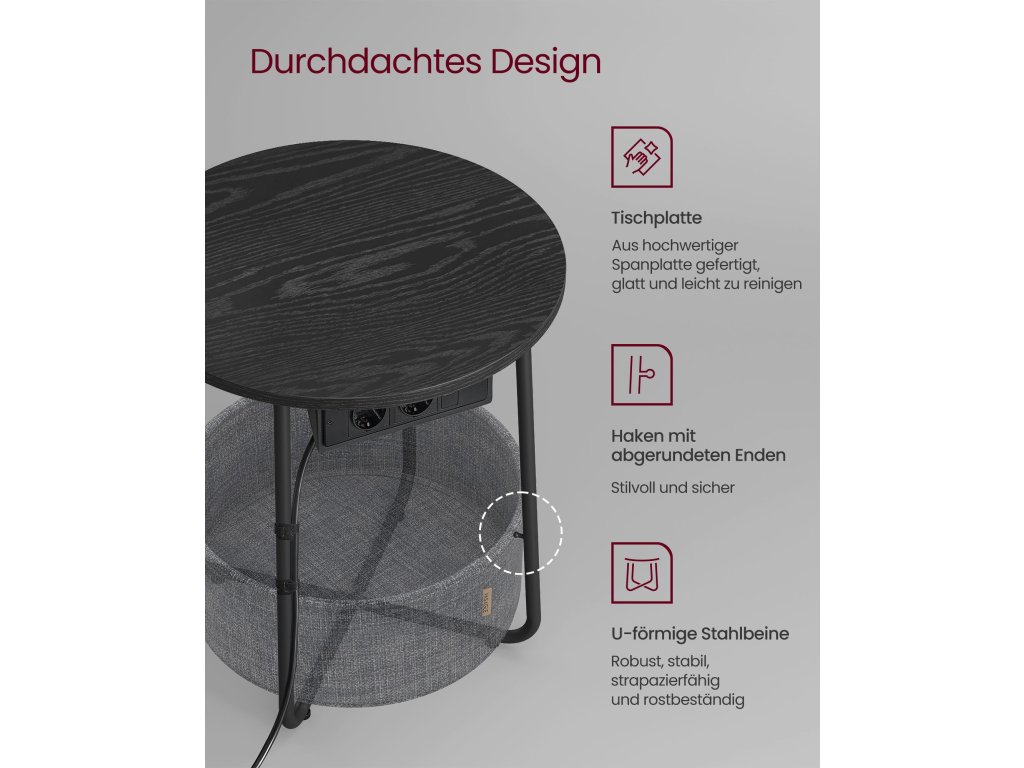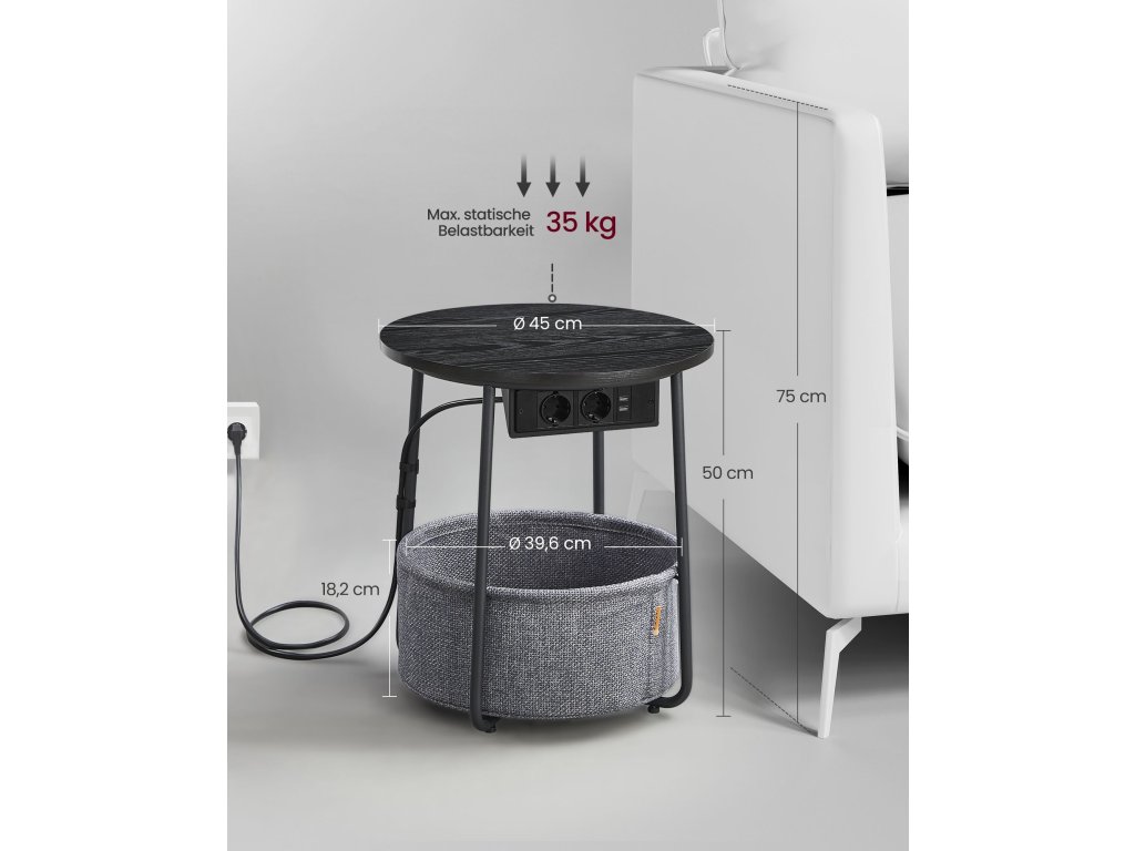 Pohodlná zásuvka Tento kulatý stolek je vybaven 2 zásuvkami a 2 porty USB pod deskou stolu a pomáhá vám nabíjet lampu, mobilní telefon a další zařízení. tablet a další zařízení, abyste nemuseli hledat další zásuvky.Ideální do malých místností Tento malý stolek s košem se díky svým kompaktním rozměrům 45 x 50 cm (Ø x V) dobře hodí do malých místností. Jako příruční stolek v obývacím pokoji nebo noční stolek v ložnici nezabere mnoho místa a zároveň poskytuje dostatek úložného prostoru.Robustní a stabilní Robustní dřevotřískové desky lze pevně a bez viklání připevnit k rámu. Jednodílné ocelové nohy ve tvaru písmene U poskytují stabilní oporu. Nastavitelné nožičky zvyšují stabilitu a chrání podlahu před poškrábáním.Vysoce kvalitní koš Koš je vyroben z hladké dvouvrstvé polyesterové tkaniny a vypadá krásně. Nemá také žádné chemické nátěry a zajišťuje bezpečné používání. Díky lněnému vzhledu získává tento konferenční stolek jedinečný nádech.Snadná montáž Díky jednoduché konstrukci, označeným dílům a jasným pokynům můžete tento obývací stůl se zásuvkami sestavit za 10-15 minut a rychle si užít pohodlí.| Kategorie: | Odkládací stolky |