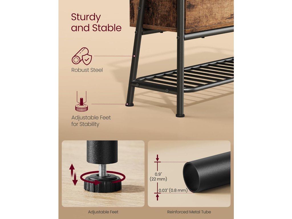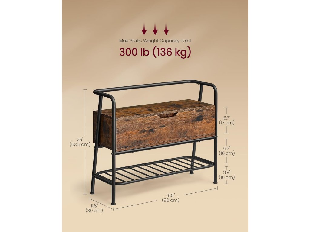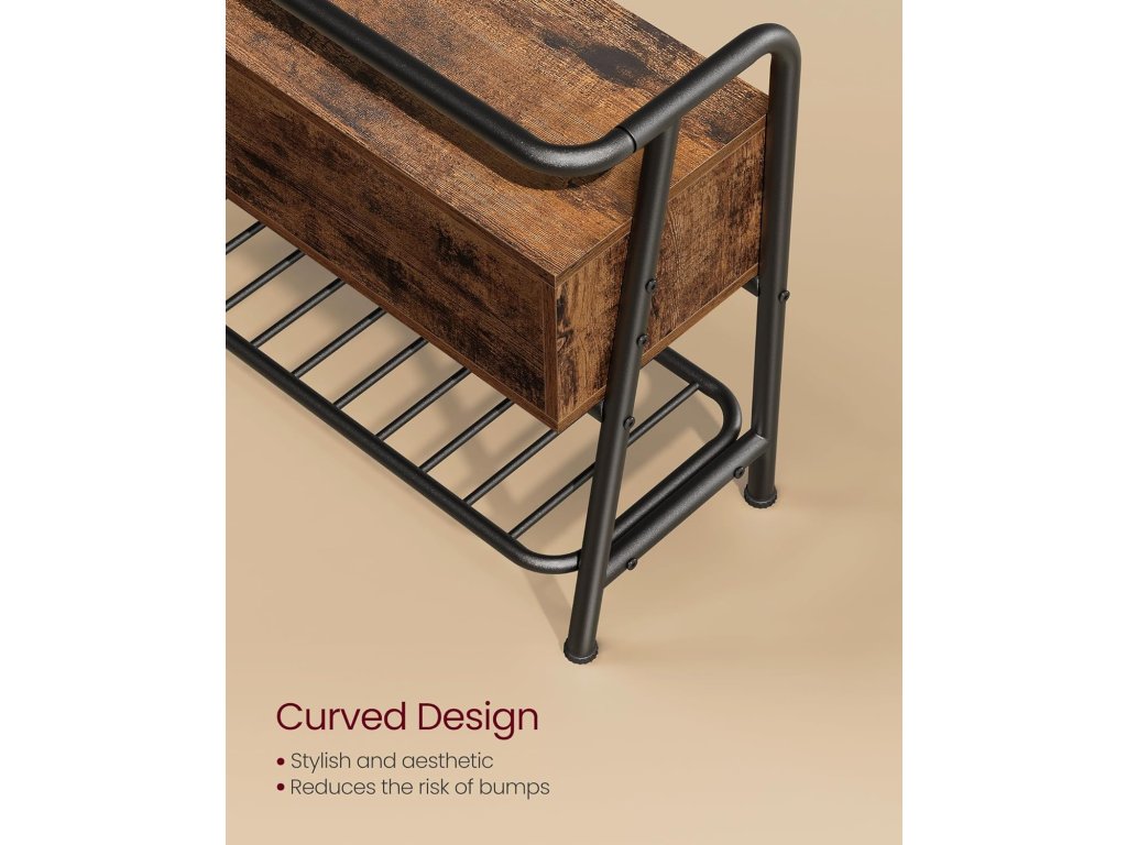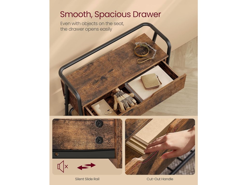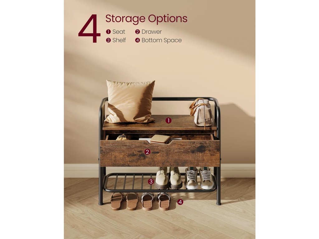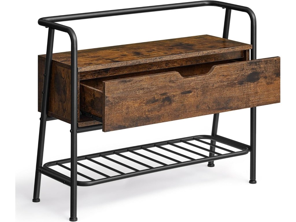 Lavice na boty, botník, s úložnou zásuvkou, předsíňový nábytek, industriální styl, ocelový rám, do obývacího pokoje, ložnice, předsíně, rustikální hnědá a inkoustově černá.