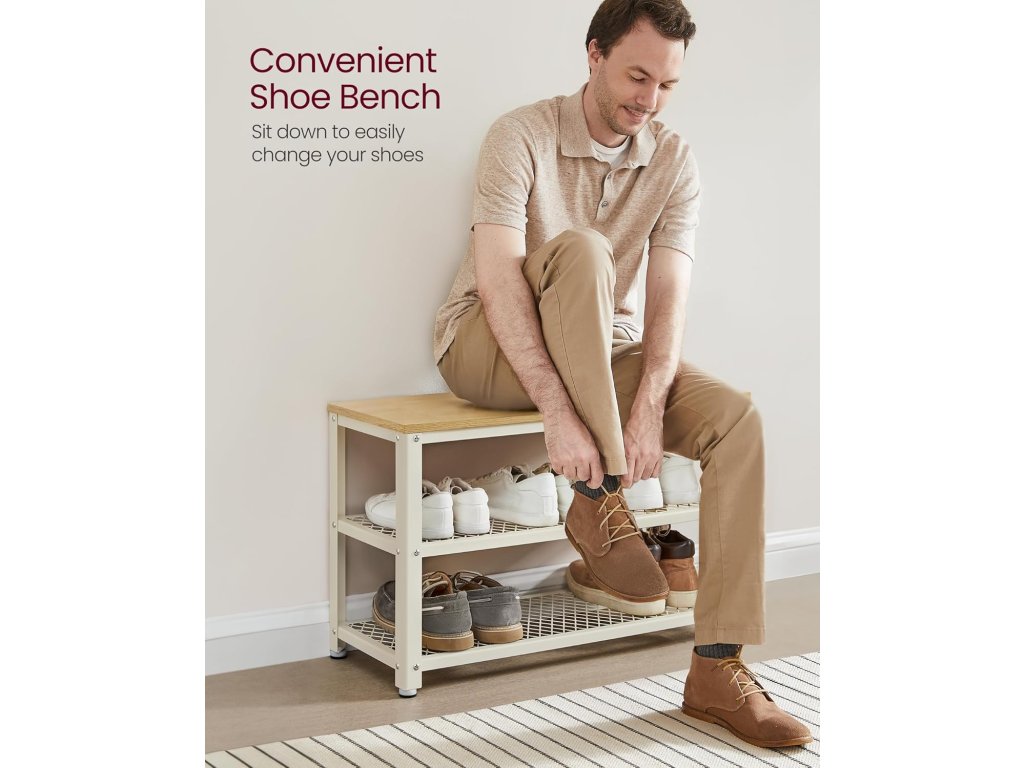 Lavice na boty, botník se 2 policemi, organizér na boty, 30 x 73 x 45 cm, předsíň obývacího pokoje, ocelová konstrukce, industriální styl, dub béžový a klasická bílá.