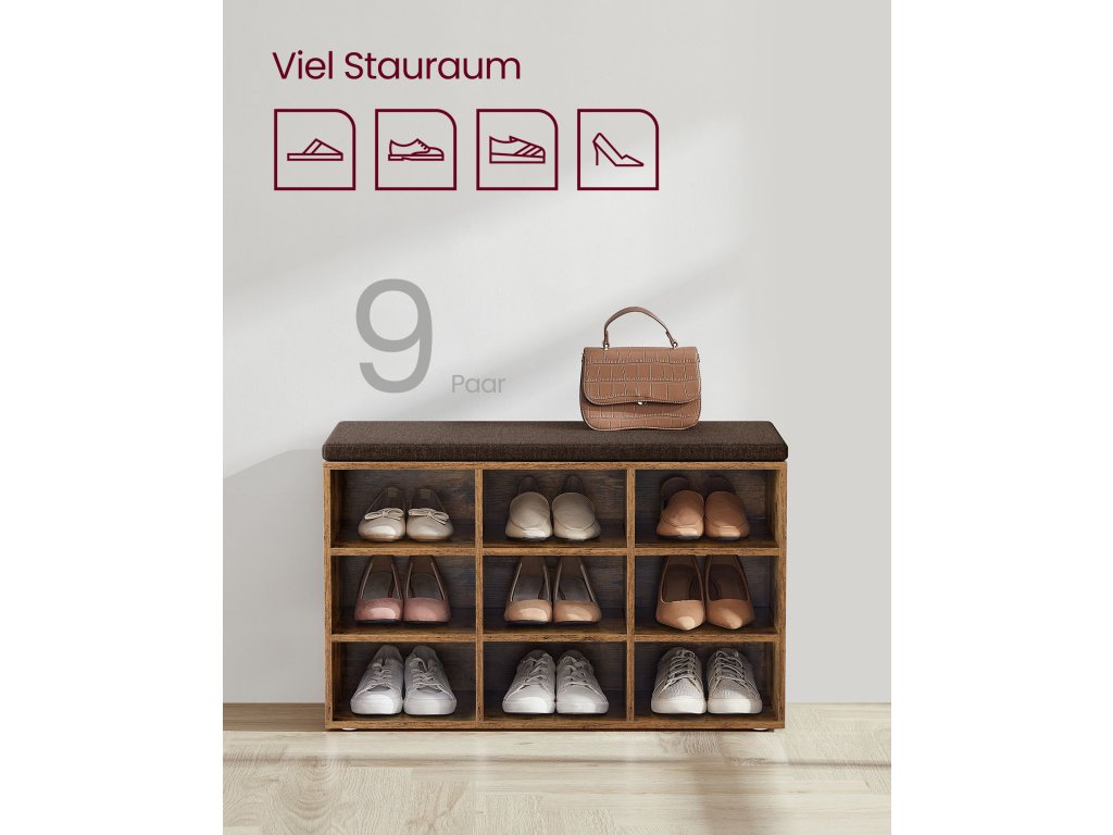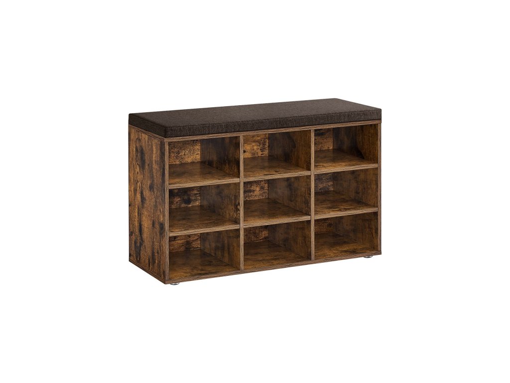 Lavice na boty, úložná lavice s polstrovaným sedákem, s polštářem, 9 přihrádek, nastavitelné police, do obývacího pokoje, předsíně, 30,3 x 78,5 x 48 cm, rustikální hnědá.