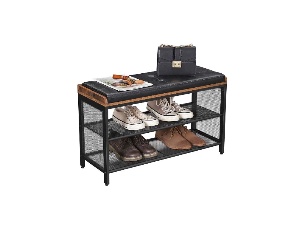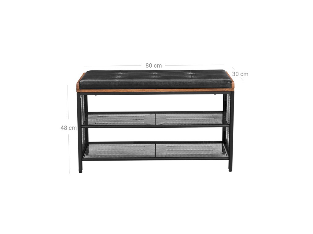 Polstrovaná lavice s policemi na boty 80 x 30 x 48 cm, průmyslový design, umělá kůže, vintage hnědá černá.