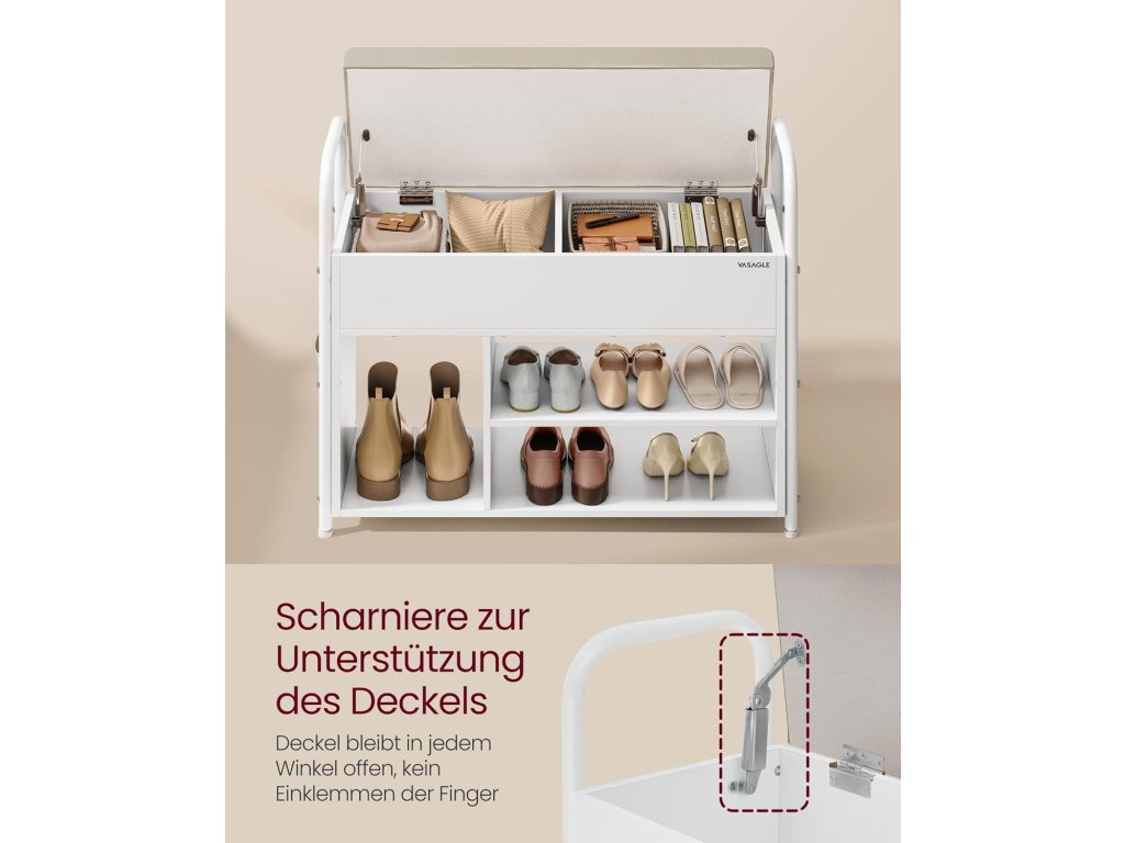 Velký úložný prostor: prostorná přihrádka pod víkem je ideální pro uložení rukavic, vodítek pro psy a deštníků. Police jsou vhodné pro různé druhy obuviPraktický organizér: tato lavice na boty má boční PU organizér se 2 malými kapsami, do kterých lze snadno uložit drobné předměty.2 vysoce kvalitní panty: víko tohoto botníku má panty, které zajišťují bezpečné otevírání v jakémkoli úhlu a zabraňují zachycení prstů.Optimální pohodlí při sezení: 5 cm silný polstrovaný sedák s PU potahem zajišťuje pohodlné sezení, zatímco hladké, zaoblené rukojeti umožňují snadný pohyb lavice.Stabilní a bezpečná: díky robustnímu 22mm ocelovému rámu je lavička robustní a unese až 91 kg. Nastavitelné nohy bezpečně stojí i na nerovných podlahách| Kategorie: | Lavice do předsíně |