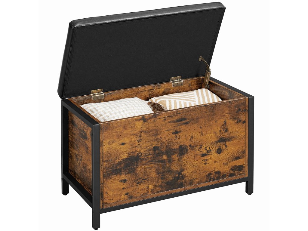 ZVÝRAZNĚTE TUTO HODNOTU: Kdo najde truhlu s pokladem, může se považovat za šťastlivce. Tato truhla sice není zlatá, ale lesklý povrch ze syntetické kůže s látkovými záhyby a knoflíky spolu s černým železným rámem a dřevěnými rustikálními akcenty jsou také důvodem k radosti.SE SKRYTOU PŘIHRÁDKOU: Pod velkorysou plochou sedadla se skrývá prostorná přihrádka na polštáře, pyžama nebo knihy. Bezpečnostní panty udržují truhlu otevřenou a chrání před skřípnutím prstů.HLEDÁTE TIPY NA VYBAVENÍ? Pohodlná lavička se skvěle hodí jako další sedátko v předsíni, abyste při obouvání nezakopávali. Pokud při oblékání džínů častěji zakopáváte, umístěte tento skříňový nábytek jednoduše do ložnice jako lavici k posteli.