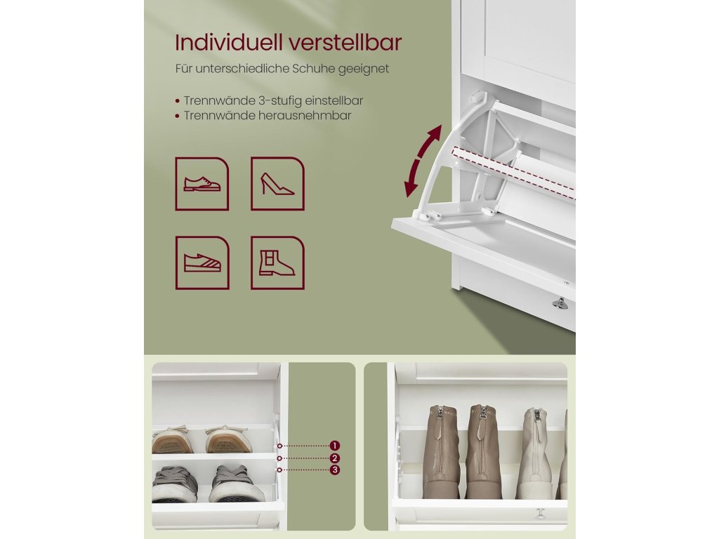 Prostorný a všestranný: skříňka na boty nabízí místo až pro 18 párů bot. Díky horní desce máte k dispozici také prostor pro rostliny, obrázky nebo suvenýry, takže váš pokoj bude nejen uspořádaný, ale také jedinečný.Nastavitelný a optimalizující prostor: díky odnímatelným a ve třech směrech nastavitelným přepážkám lze tento výklopník na boty přizpůsobit vašim potřebám a různým typům obuvi - jednoduše jej upravte a optimalizujte svůj prostor.Důvěřujte odolnosti: tento botník je vyroben z vysoce kvalitních, robustních desek a je vybaven zadním panelem, který chrání před prachem a hmyzem.Stylový design, moderní vzhled: úložná skříňka zaujme svým moderním a jednoduchým designem. Díky bílé povrchové úpravě a rafinovaným kovovým úchytkám dodá vaší vstupní hale elegantní nádech.Bezpečný a stabilní: díky zvýšeným okrajům chrání botník vaše předměty na horní desce před pádem. Díky přiložené ochraně proti překlopení jej lze pevně připevnit ke stěně a vytvořit tak bezpečné prostředí pro používání.| Kategorie: | Botníky |