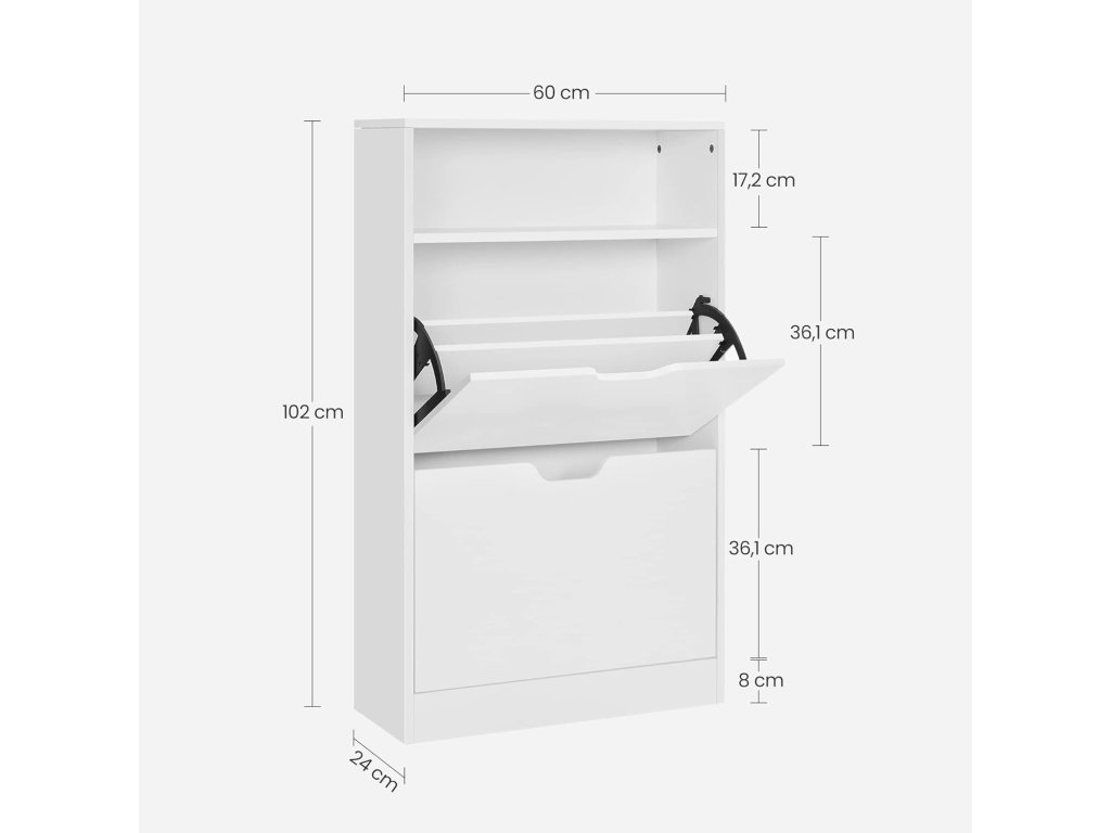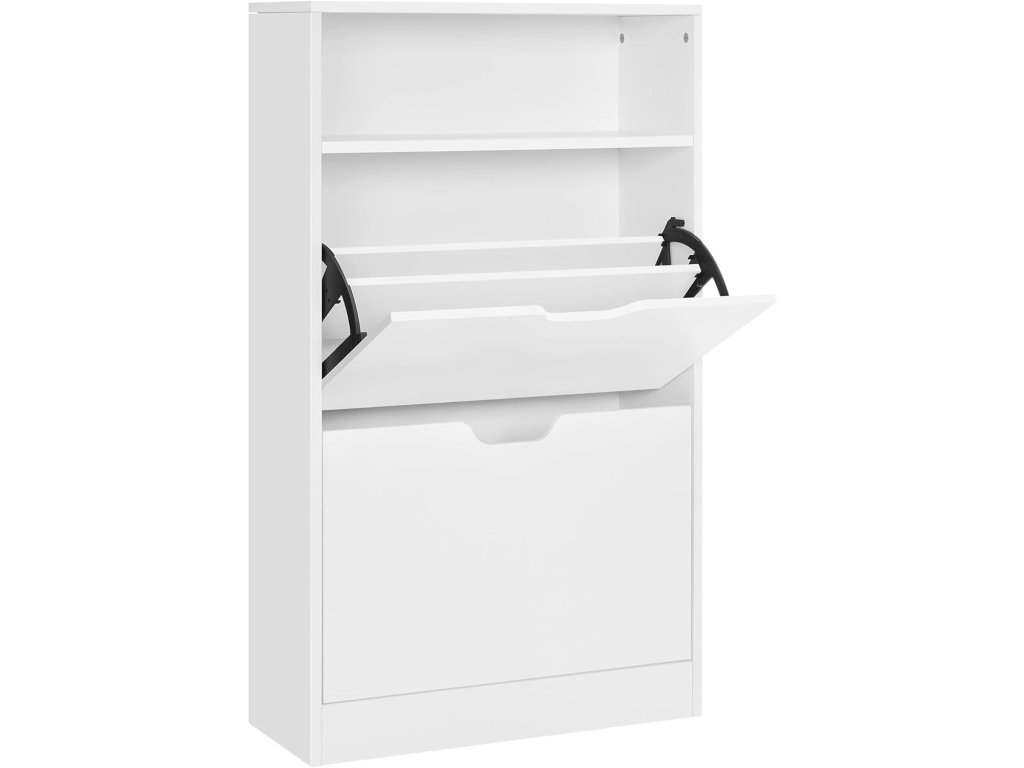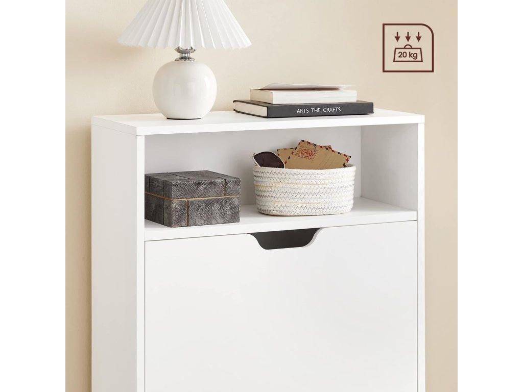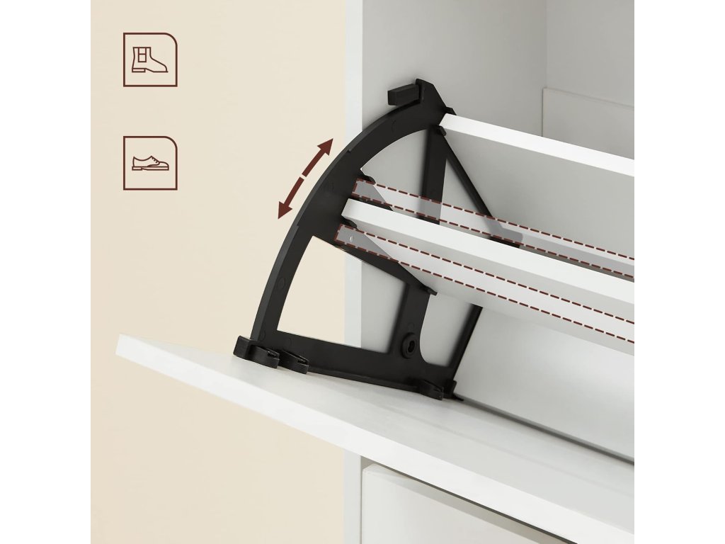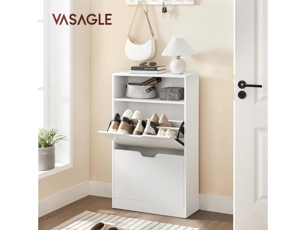 Ztělesnění stylu: uložte své boty do tohoto botníku od společnosti VASAGLE a udržujte je v perfektním stavu. Elegantní bílá barva odráží váš dobrý vkus a osobnost stejně jako vaše boty.BOJ S CHAOSEM BOT - Botník má 2 chlopně, které pojmou celkem 12 párů dámských nebo 8 párů pánských bot. Přepážky lze také vyjmout, aby se do skříně vešly boty nebo lodičky.