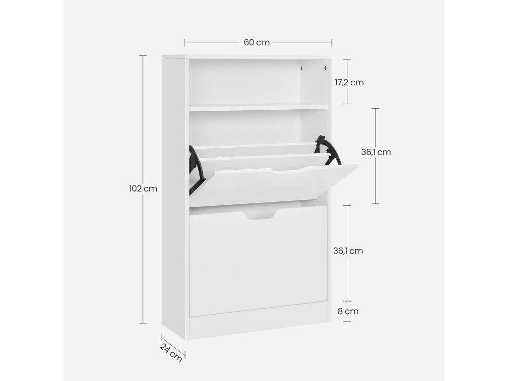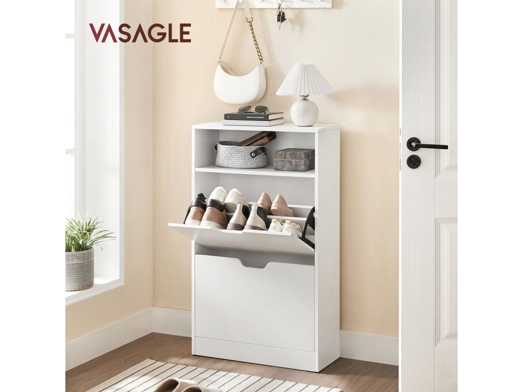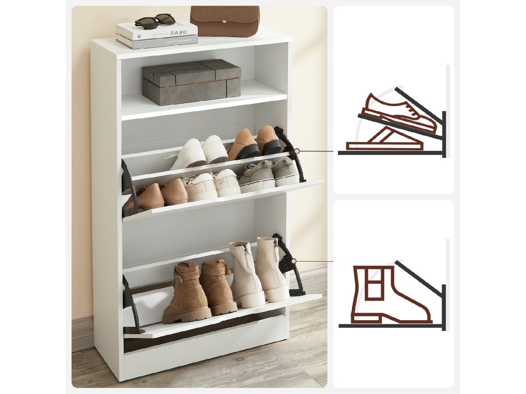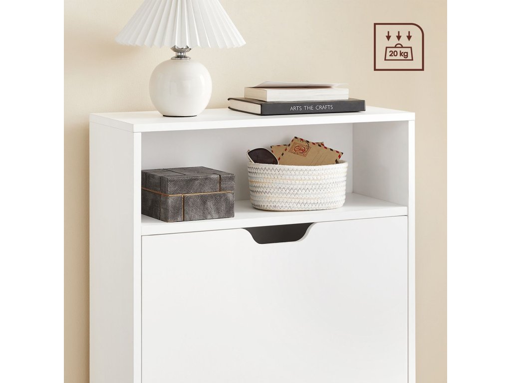 Ztělesnění stylu: uložte své boty do tohoto botníku Vasagle a udržujte je v perfektním stavu. Elegantní bílá barva i vaše boty odrážejí váš dobrý vkus a osobnost.Bojujte s nepořádkem: skříň na boty má 2 chlopně, které pojmou 12 párů dámských nebo 8 párů pánských bot. Přepážky lze také vyjmout, aby se do skříně vešly boty nebo lodičky.Úložný prostor v předsíni - otevřená přihrádka a horní police tohoto botníku jsou ideální pro uložení osobních věcí: klíčů, slunečních brýlí, peněženky, vše na dosah a na první pohled.Odolná ochrana: tento botník o rozměrech 60 x 24 x 102 cm je vyroben z odolné dřevotřísky, zadní panel chrání stěny před znečištěním od bot.Co získáte: označené díly, snadnou montáž, skříňku na boty s další přihrádkou, ochranu proti vyklopení a způsob, jak dostat chodbu nahoru!| Kategorie: | Botníky |