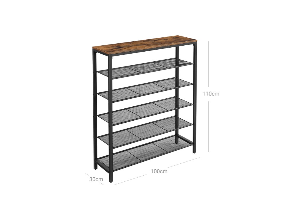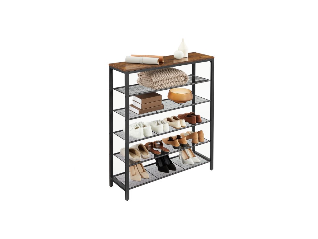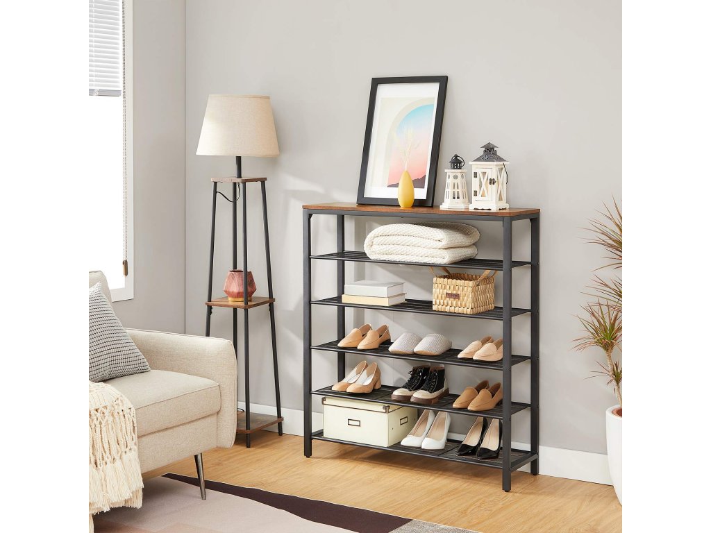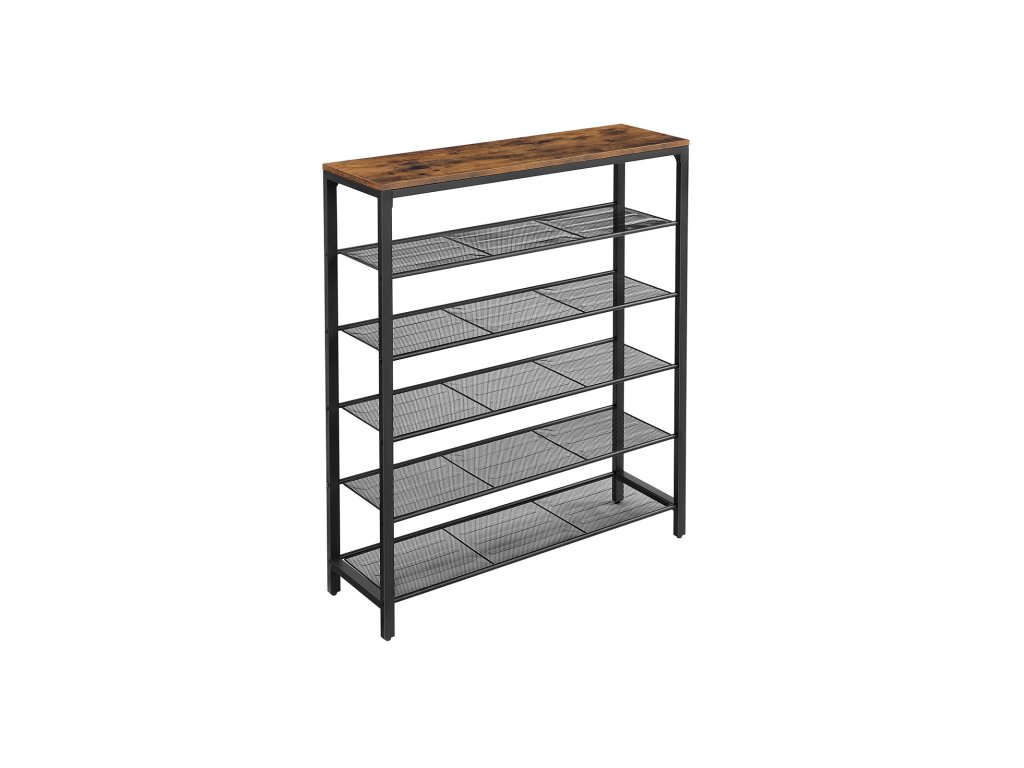 Věšák na boty s 5 úrovněmi mřížky a velkou plochou pro vchod, předsíň, kovový průmyslový rám, vintage hnědočerná barva.