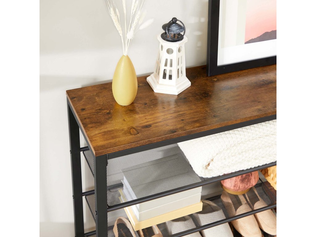Balení 3 kusů. Obdržíte polici se stylovou povrchovou úpravou s efektem dřeva - stojan na boty s 5 úrovněmi černé mřížky a stylový dekorativní prvek ve stylu továrny pro váš vstupní prostor.