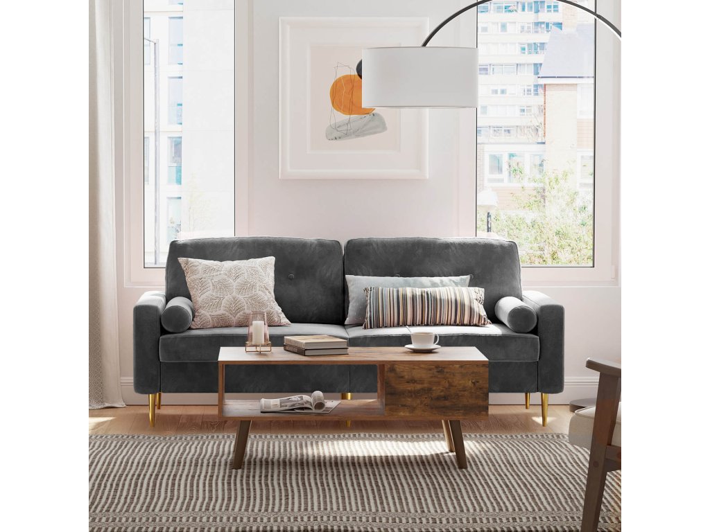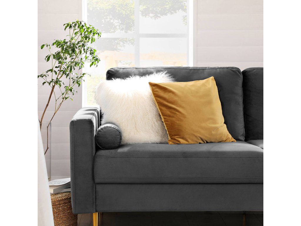 Třímístná pohovka do obývacího pokoje se sametovým potahem v moderním designu.