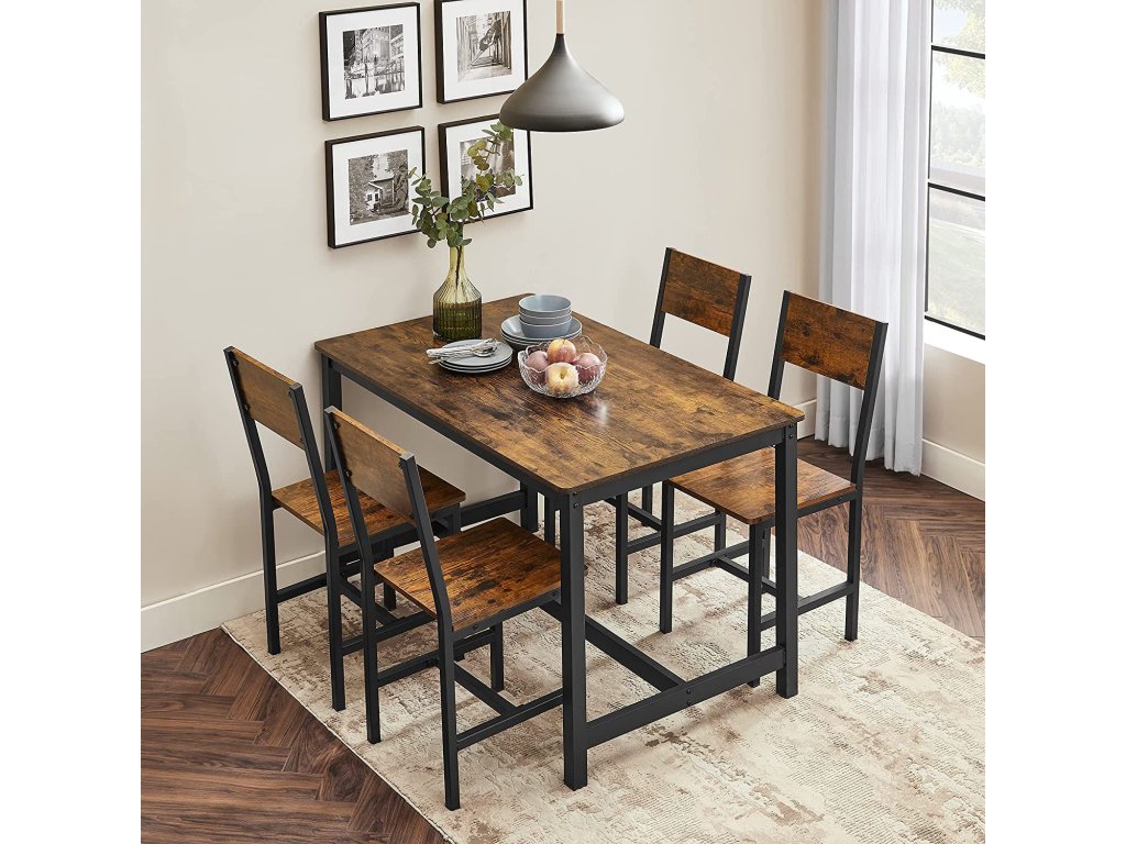 Matný černý ocelový rám v kombinaci s deskami v teplé rustikální hnědé barvě vytváří elegantní sadu židlí pro příjemnou atmosféru jídelního stolu.