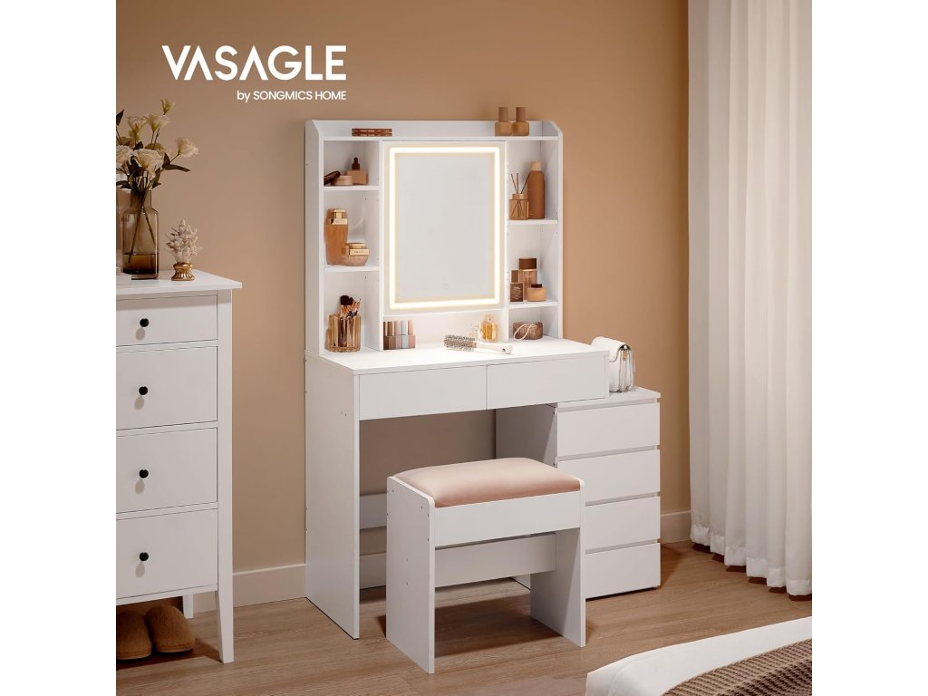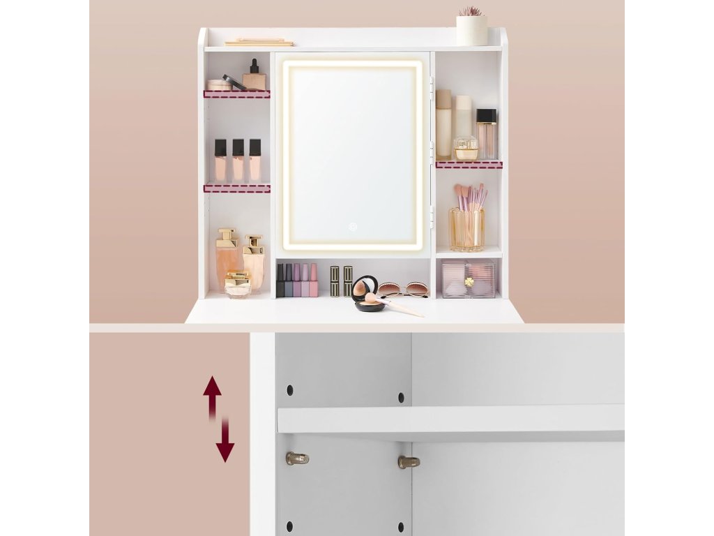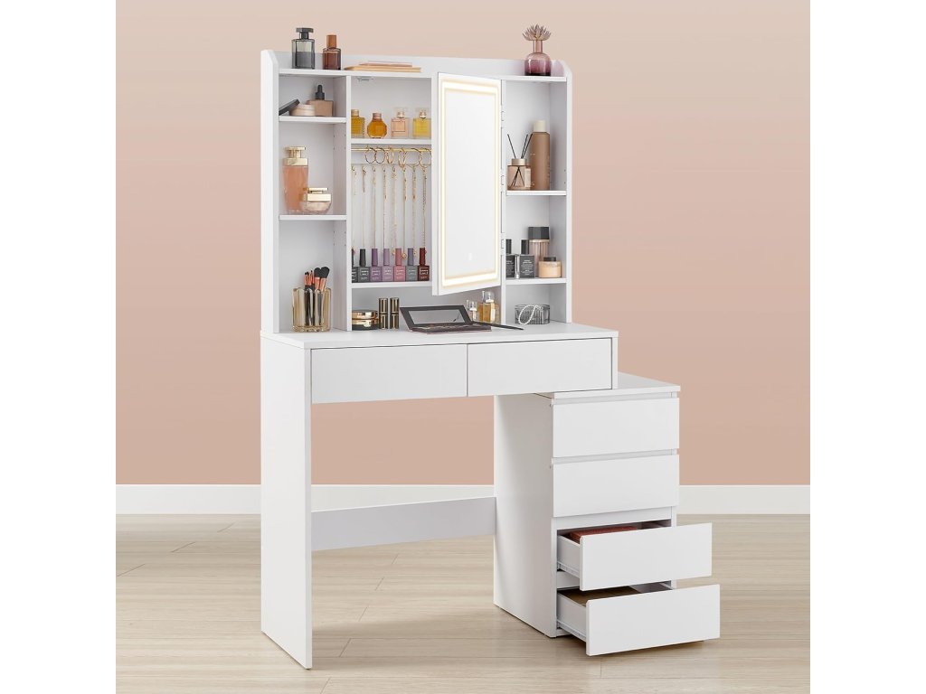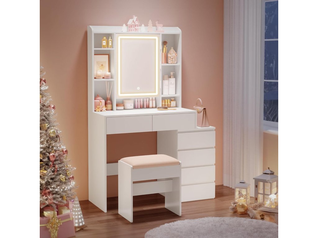 Toaletní stolek se zrcadlem, zásuvkami, otevřenými přihrádkami, nastavitelnými policemi, stoličkou, nastavitelným jasem, moderní, bílý.