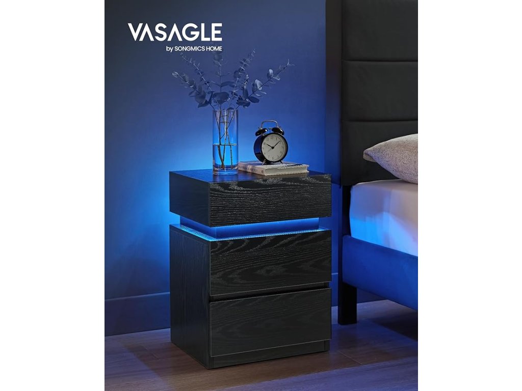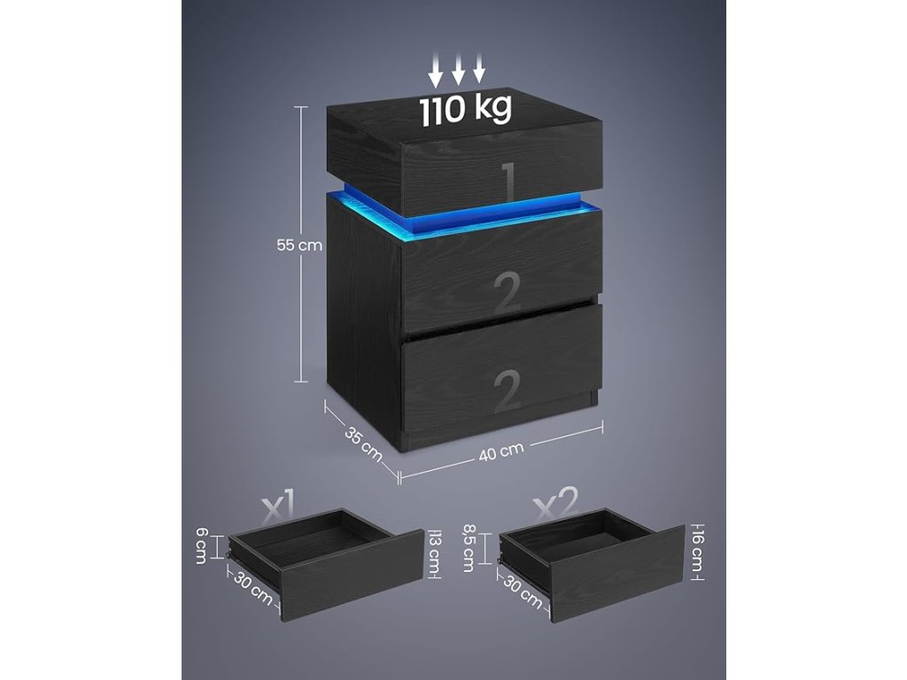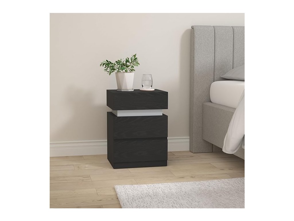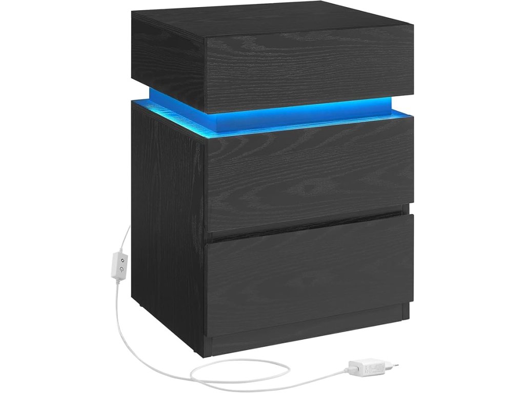 Noční stolek s LED osvětlením, odkládací stolek, noční stolek, rozkládací stolek, nastavitelné barvy, 3 zásuvky, ložnice, moderní, 35 x 40 x 55 cm, černý s dřevěnou kresbou.