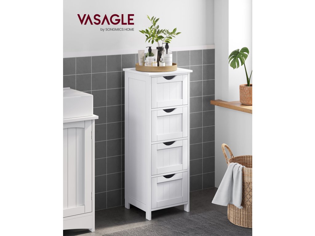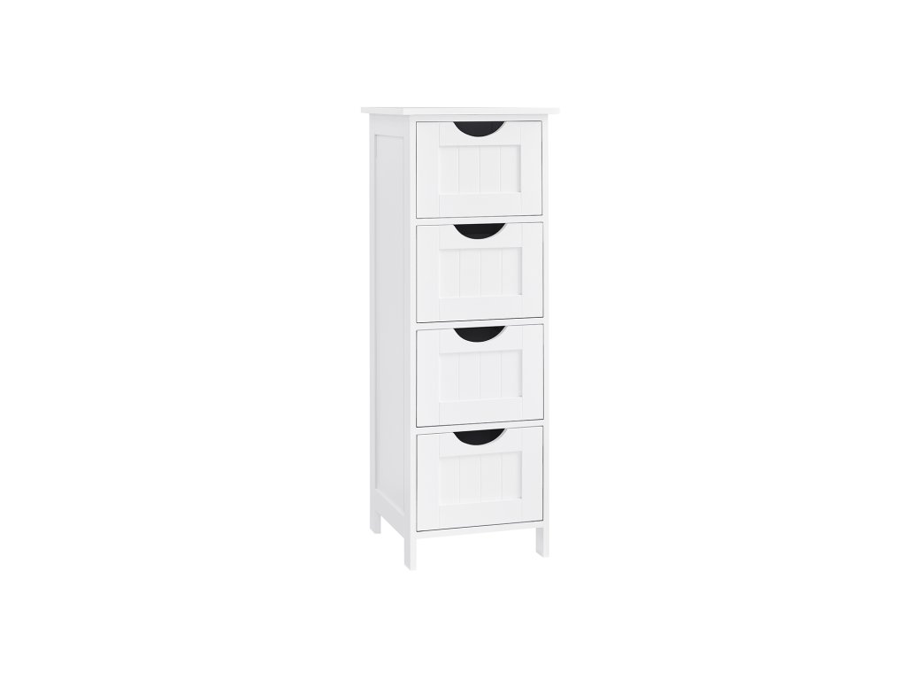Koupelnová skříňka se 4 zásuvkami, komoda, 30 x 30 x 82 cm, do obývacího pokoje, kuchyně a předsíně, šetří místo, bílá barva.
