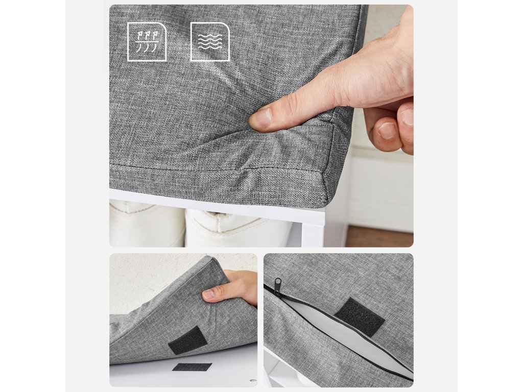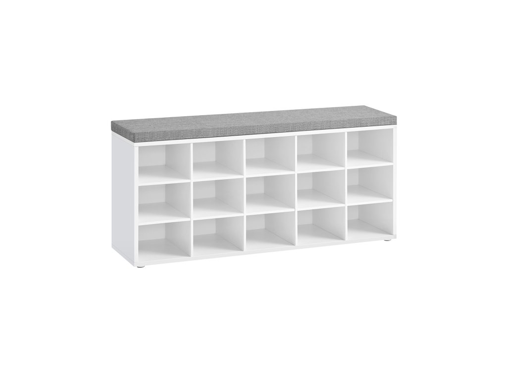 Lavice na boty se sedákem, polštářem a 15 přihrádkami pro ukládání do předsíně, pojme až 200 kg, bílá, šedá.