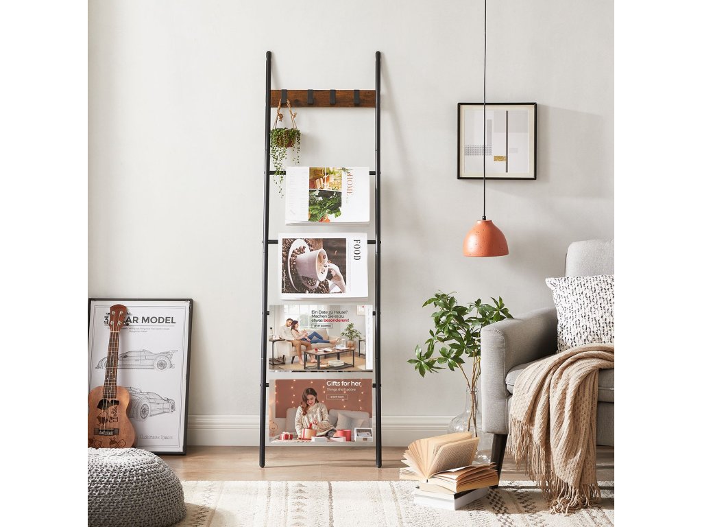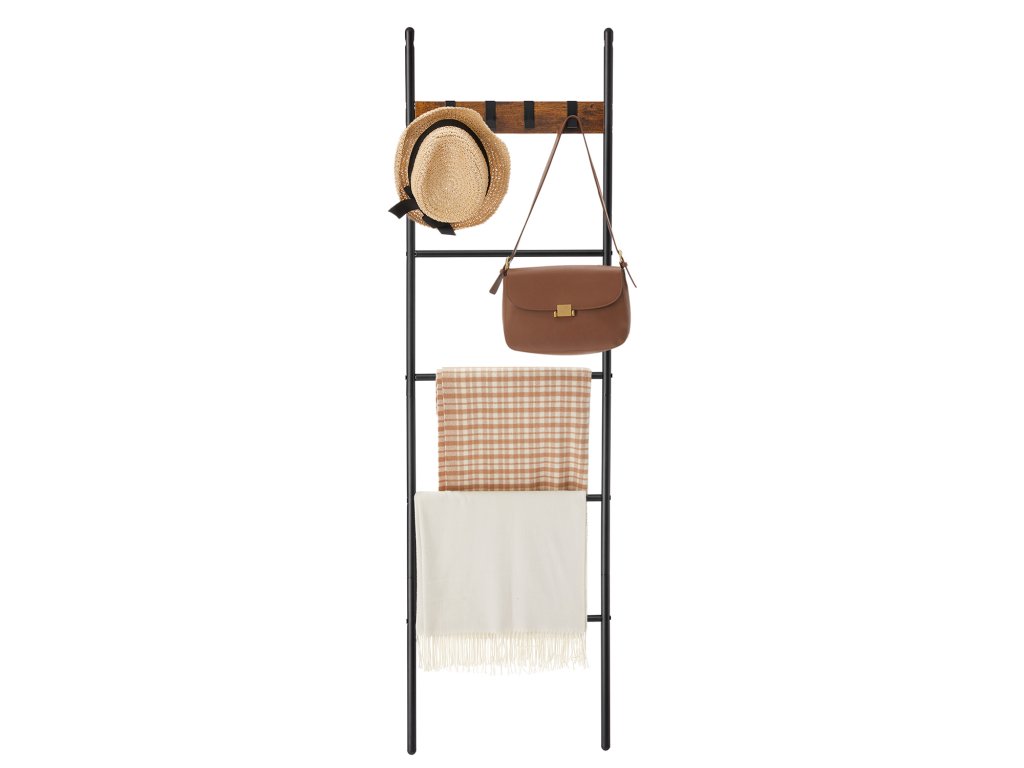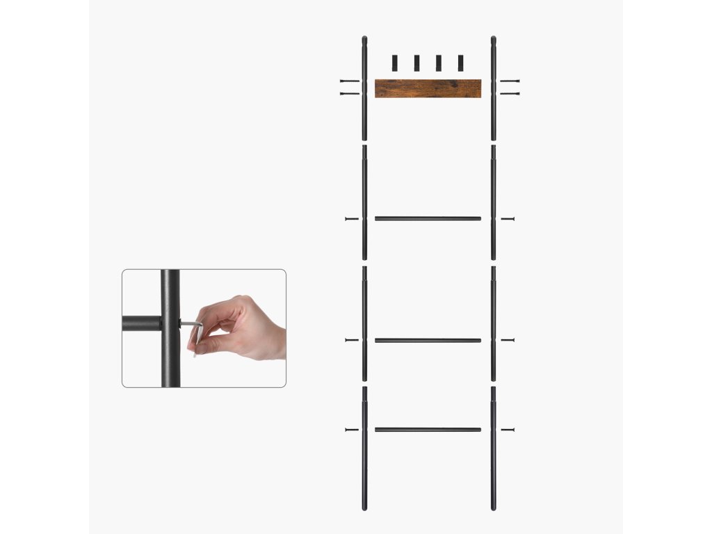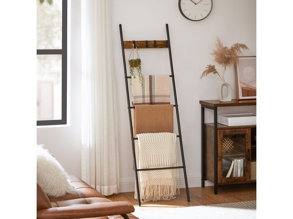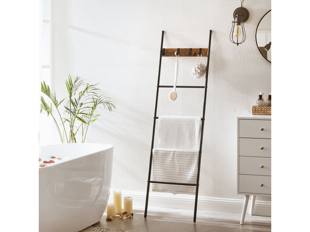 Žebřík na ručníky s 5 úrovněmi 44 x 160 cm, úspora místa, kovový rám, 4 háčky, Vintage hnědá/černá.