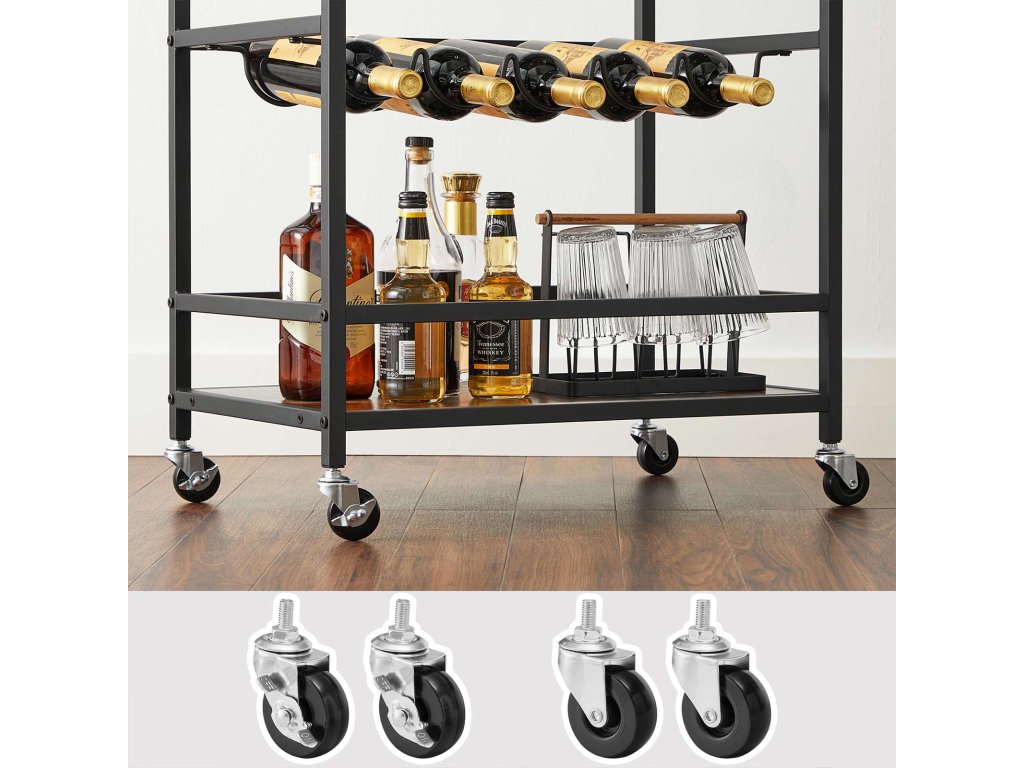 Zastavit a valit! Díky čtyřem kolečkům otáčejícím se o 360° (2 z nich mají brzdy) se tento kuchyňský regál může proměnit v pojízdný bar. 4 tyče na dně zabraňují pádu lahví! Kutálejte ji, aniž byste zkazili večírek.