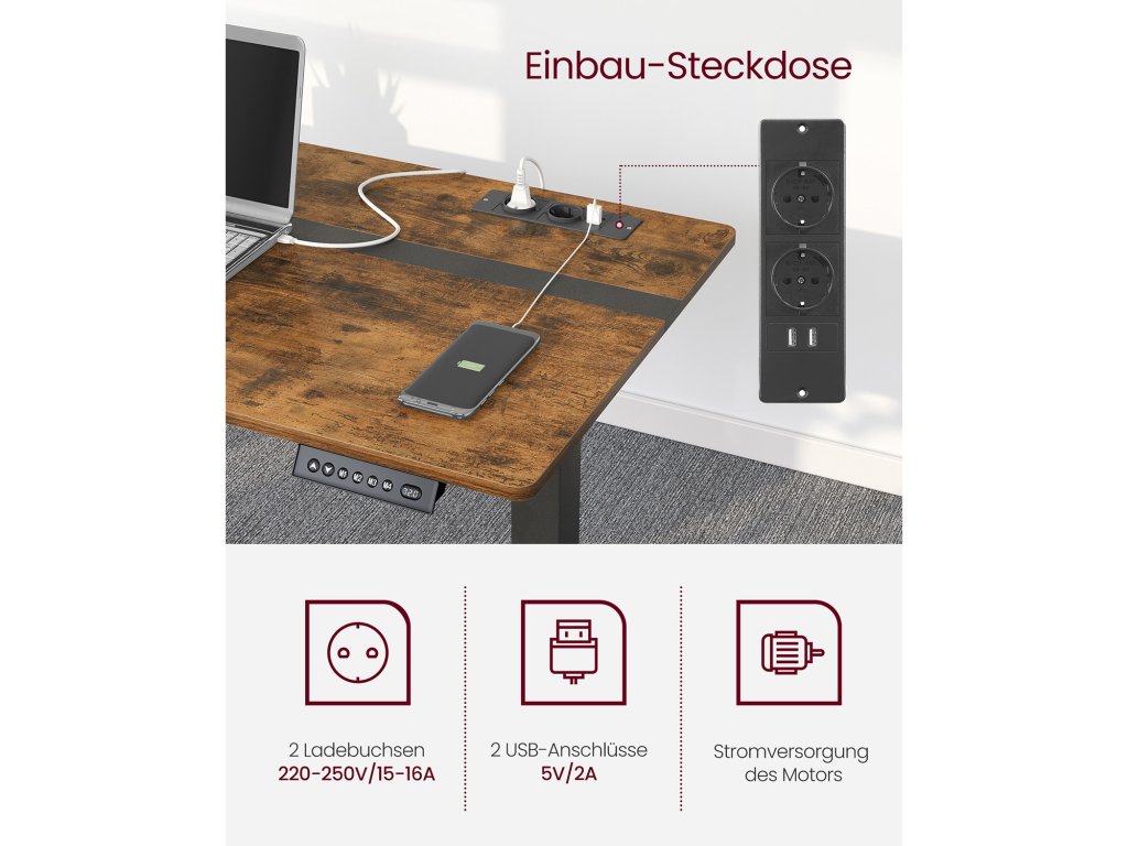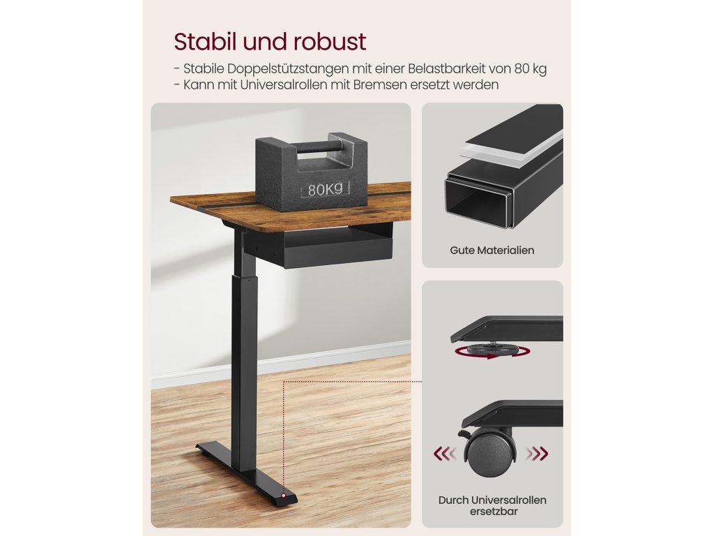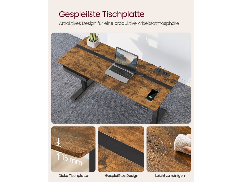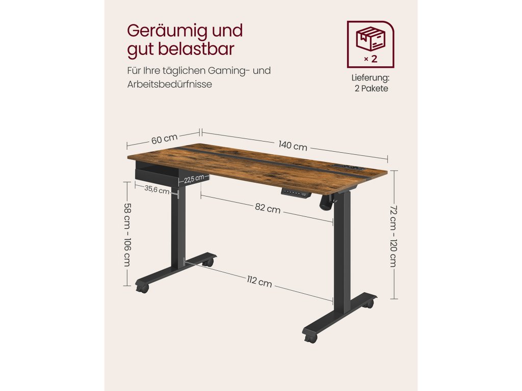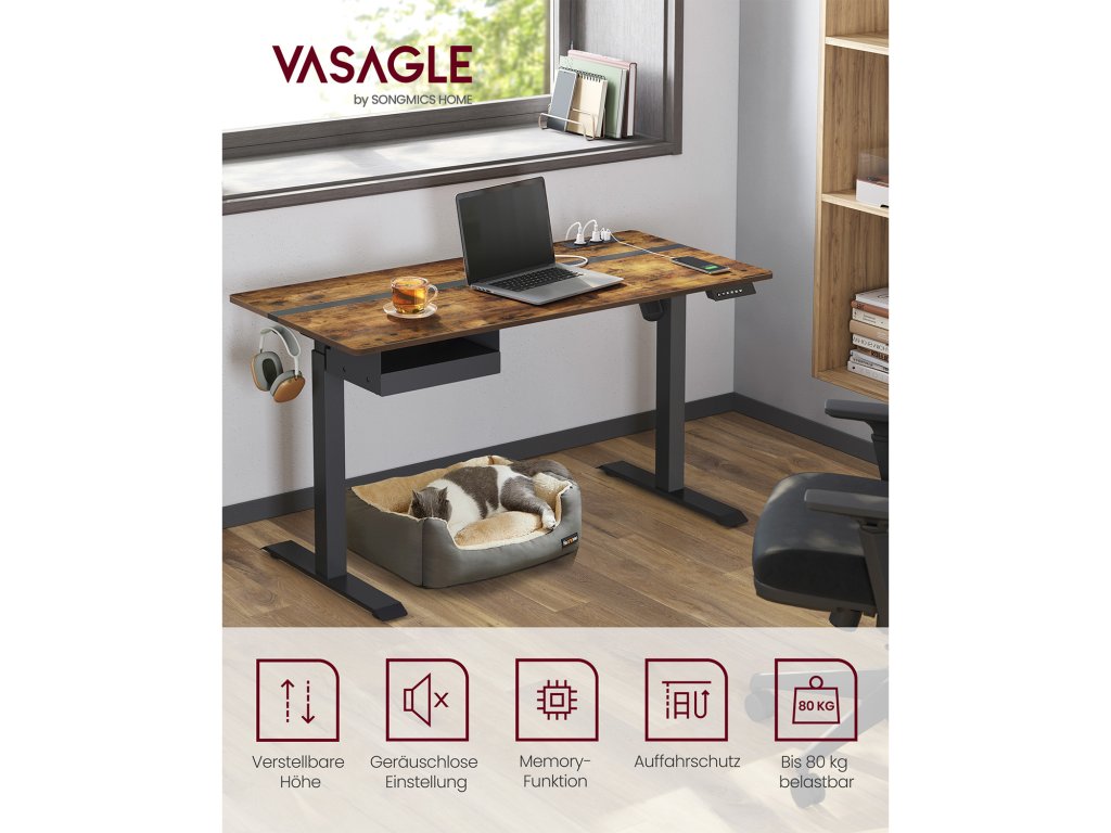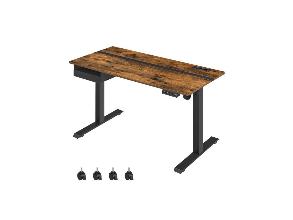 Výškově nastavitelný elektrický psací stůl se zásuvkou, plocha stolu 60 x 140 cm, plynule nastavitelná, paměťová funkce se 4 výškami, Vintage hnědo-černý.