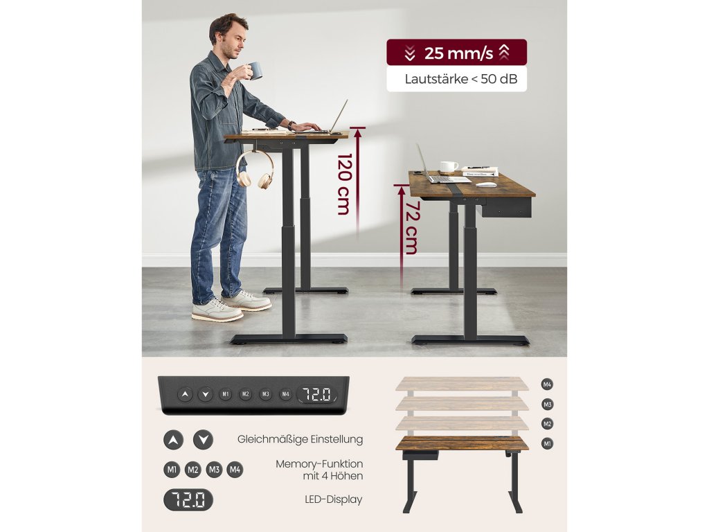 NASTAVITELNÁ VÝŠKA A FUNKCE PAMĚTI: Tento stůl je plynule výškově nastavitelný v rozmezí 72 až 120 cm a má velmi nízkou hladinu hluku při nastavení výšky (< 50 dB). Celkem 4 výšky lze uložit jako rychlé nastavení. Vestavěná zásuvka a integrovaná kabeláž: Díky 2 nabíjecím kontaktům a 2 portům USB stačí k napájení motoru a nabíjení mobilního telefonu a dalších zařízení dohromady pouze jeden kabel. Splétaná stolní deska: Různé barvy a odpovídající podmínky připojení dodávají tomuto stolnímu stojanu styl a vytvářejí produktivní pracovní atmosféru. ZÁSUVKA A HÁČKY: Malá zásuvka (22,7 x 32,5 x 4,0 cm) na kancelářské potřeby, horní část zásuvky na notebook nebo dokumenty; Háček na boku lze použít k zavěšení sluchátek, aby byl zajištěn snadný přístup. Robustní a stabilní: dvojité nosníky a robustní nohy zajišťují stabilní oporu (zatížení až 80 kg); nastavitelné nohy lze nahradit 4 koly s brzdami, díky brzdám se nemusíte obávat o stabilitu;| Kategorie: | Psací a pracovní stoly |