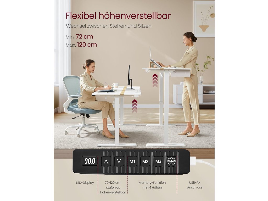 Nastavitelná výška a paměťová funkce: Tento stůl je plynule výškově nastavitelný v rozmezí 72 až 120 cm a má velmi nízkou hladinu hluku při nastavování výšky (< 50 dB). Celkem 4 výšky lze uložit jako rychlé nastavení. Vestavěná zásuvka a integrovaná kabeláž: Se 2 nabíjecími zásuvkami (220V-250V, 15A-16A) a 2 porty USB; díky integrovanému zapojení stačí k připojení napájení motoru a nabíjení zařízení pouze jeden kabel. Splétaná stolní deska: Různé barvy a vhodné proporce splétání dodávají tomuto stolu styl a vytvářejí produktivní pracovní atmosféru. Zásuvka a háček: Malá zásuvka (22,7 x 32,5 x 4 cm) na kancelářské potřeby, horní část zásuvky na notebook nebo dokumenty; boční háček lze použít k zavěšení sluchátek, aby byl přístup k nim snadnější. Robustní a stabilní: Dvojité opěrné tyče a robustní nohy poskytují stabilní oporu (až 80 kg); nastavitelné nohy lze nahradit 4 koly s brzdami, díky nimž se nemusíte obávat o stabilitu;