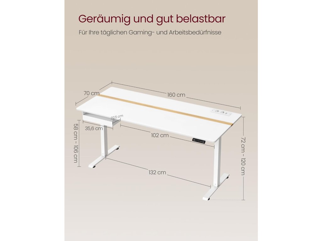Výškově nastavitelný elektrický psací stůl se zásuvkou, 70 x 160 cm, plynule nastavitelná deska, paměťová funkce se 4 výškami, bílo-zlatý.