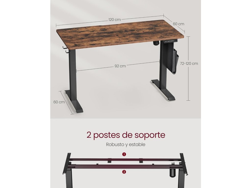 Výškově nastavitelný psací stůl elektrický, dřevotřísková deska, ocel, tkanina Oxford, hnědá vintage, 120 cm.