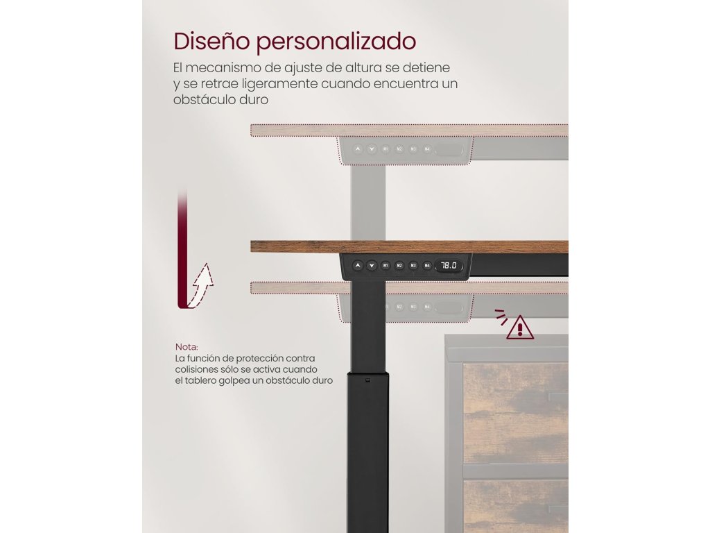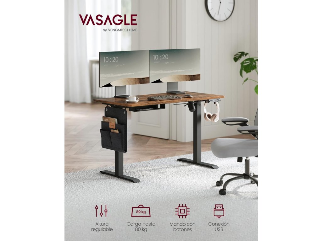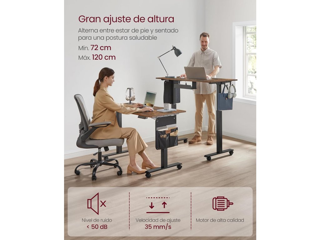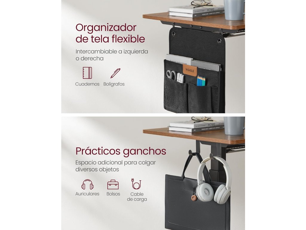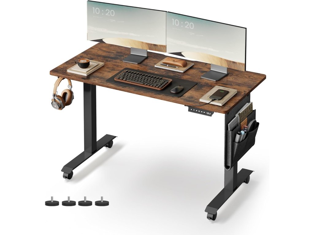 Multifunkční ovladač: tlačítka nahoru a dolů umožňují nastavit výšku rámu stolu v rozmezí 72 až 120 cm. Díky paměťové funkci si můžete uložit 4 oblíbené výšky; je zde další port USB pro nabíjení mobilního telefonu;Organizér a háčky po stranách: vlevo nebo vpravo vyměnitelný látkový organizér na knihy a psací potřeby, další dvojitý háček na sluchátka a tašky. Nic neprospívá vašemu soustředění více než uklizený pracovní stůl!.Ochrana proti nárazu Z bezpečnostních důvodů se mechanismus výškového nastavení zastaví a výškově nastavitelný stolní stojan se elektricky mírně vrátí zpět, pokud během jízdy narazí na pevnou překážku.Stabilní a tichý - díky dvojitým opěrným tyčím, ocelovým nohám a nastavitelným nohám, které lze nahradit 4 kolečky, je stůl stabilní a unese až 80 kg. a má také nízkou hladinu hluku při nastavování výšky.