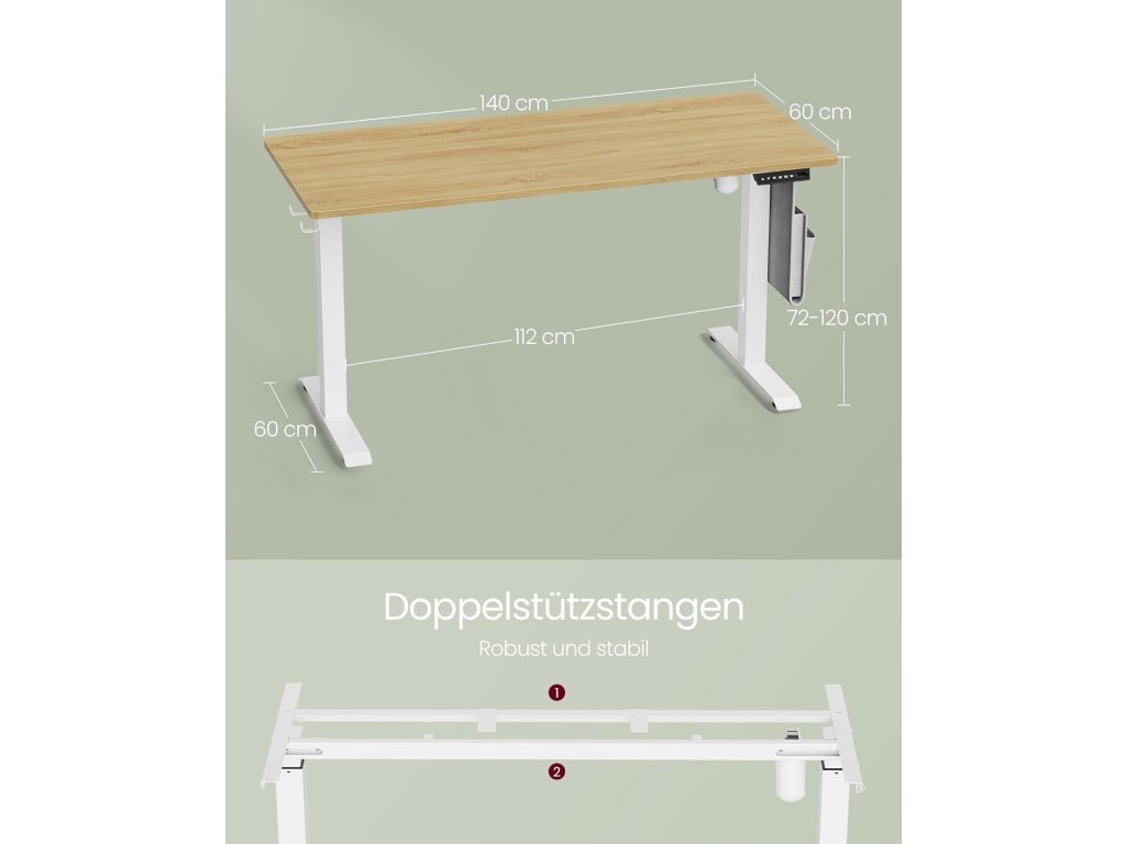 Výškově nastavitelný psací stůl elektrický, dřevotřísková deska, ocel, tkanina Oxford, barva přírodní dub, 140 cm.