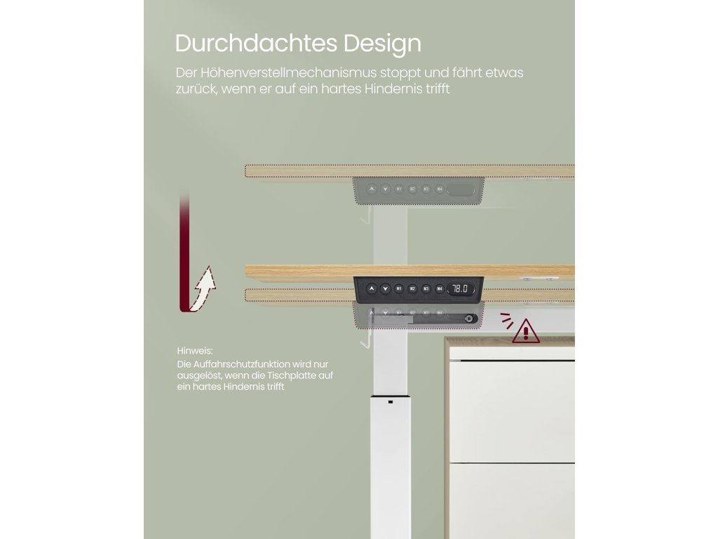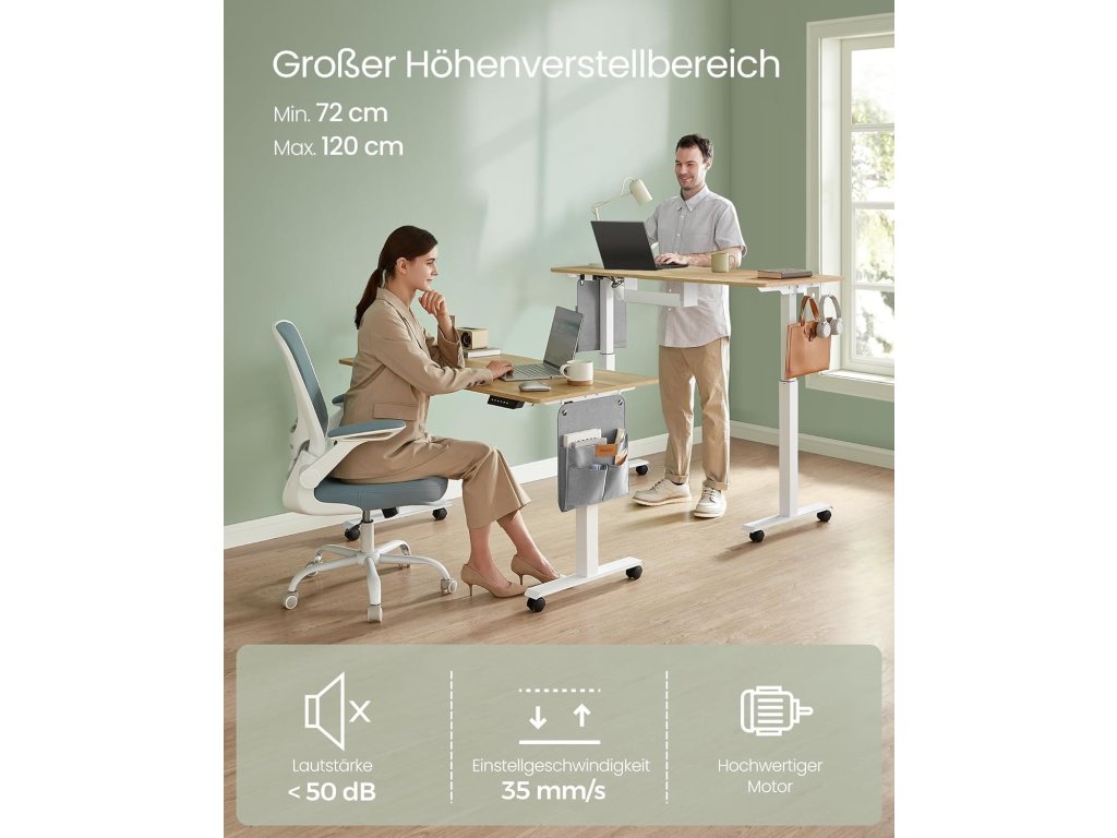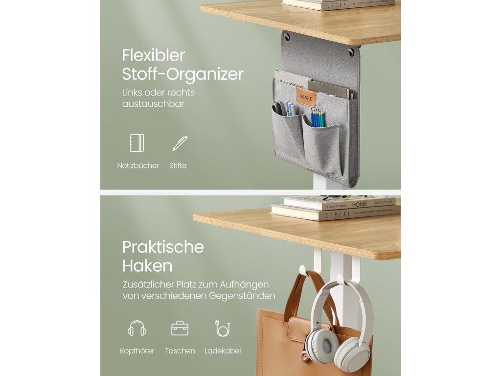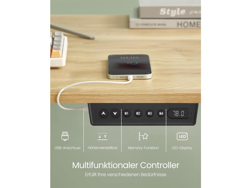 Multifunkční ovladač Pomocí tlačítek nahoru a dolů můžete nastavit výšku rámu stolu v rozmezí 72 až 120 cm; díky paměťové funkci si můžete uložit 4 preferované výšky; k dispozici je také port USB pro nabíjení mobilního telefonu;Organizér a háčky na bocích Levý nebo pravý vyměnitelný látkový organizér na knihy a psací potřeby, další dvojitý háček na sluchátka a tašky. Nic neprospívá vašemu soustředění více než uklizený pracovní stůl!.Ochrana proti kolizi Z bezpečnostních důvodů se mechanismus výškového nastavení zastaví a elektricky mírně zasune výškově nastavitelný stolní podstavec, když během jízdy narazí na pevnou překážku.Stabilita a nízká hlučnost Díky dvojitým podpěrným tyčím, ocelovým nohám a nastavitelným nohám, které lze nahradit 4 kolečky, je stůl stabilní a unese až 80 kg; má také nízkou hladinu hluku při nastavování výšky;Co získáte Výškově nastavitelný stůl s jasným návodem a označenými díly pro snadnou montáž, poličkou pro napájecí lištu a 2 otvory pro vedení kabelů, které zajišťují přehledné vedení kabelů.| Kategorie: | Psací a pracovní stoly |