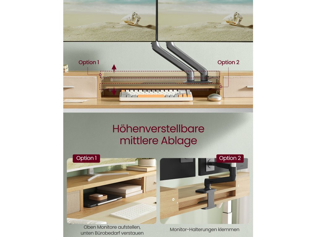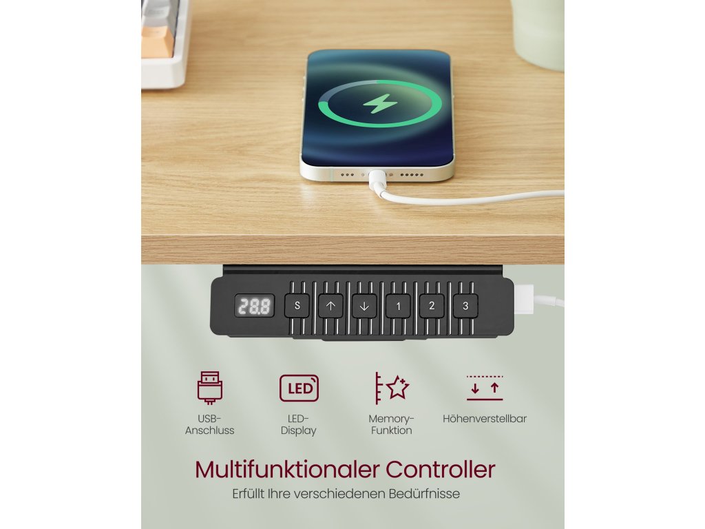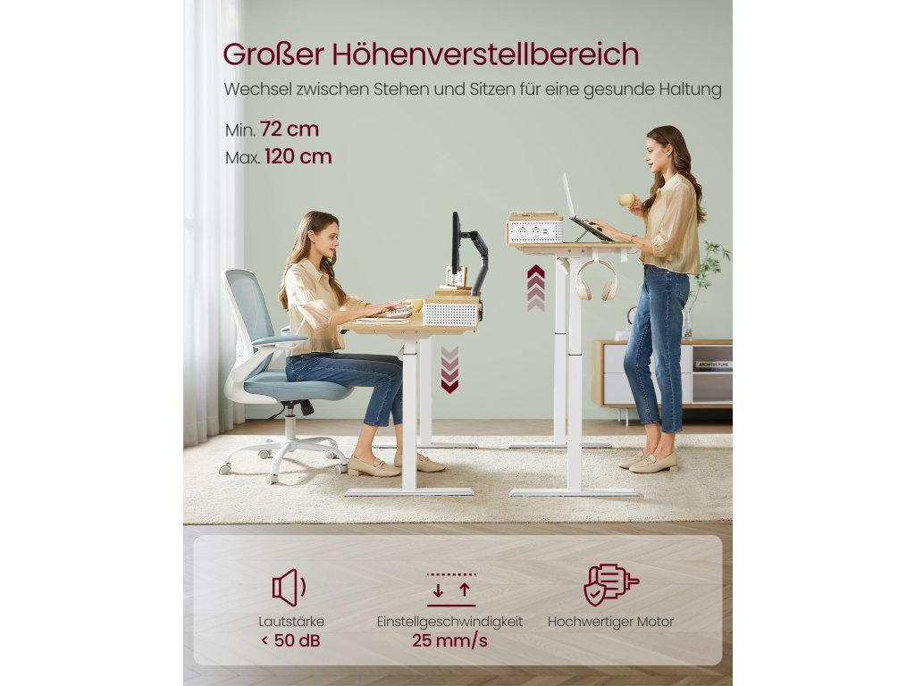 Nastavitelná výška a paměťová funkce Tento stůl je plynule výškově nastavitelný v rozmezí 72 až 120 cm. Vsedě nebo vestoje? Najděte si ideální polohu; také může uložit celkem 3 výšky jako rychlé nastavení;Vyzvednout, uložit, nabít Prostřední police stojanu monitoru je výškově nastavitelná; na jejích dvou stranách jsou 2 zásuvky na drobné předměty; perforované desky pro ukrytí kabelů a 2 zásuvky AC a 2 porty USB pro nabíjení;Vysoce kvalitní motor Zajišťuje rovnoměrné nastavení a nízkou hladinu hluku (<50 dB); mechanismus nastavení výšky se zastaví a mírně se stáhne, když narazí na překážku, aby se stůl nepoškodil.S háčkem a osvětlením Boční háček lze použít k zavěšení sluchátek pro usnadnění přístupu; přiložené nastavitelné LED osvětlení rozjasní váš pracovní prostor a zároveň zlepší atmosféru.Robustní konstrukce Dvojitá podpěrná tyč dodává této desce stolu vysokou stabilitu - už žádné kývání. Díky ocelovému rámu unese tento výškově nastavitelný stůl až 80 kg.| Kategorie: | Psací a pracovní stoly |