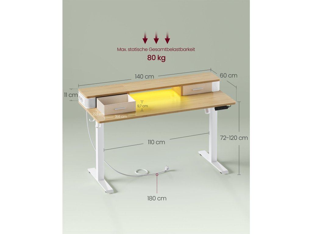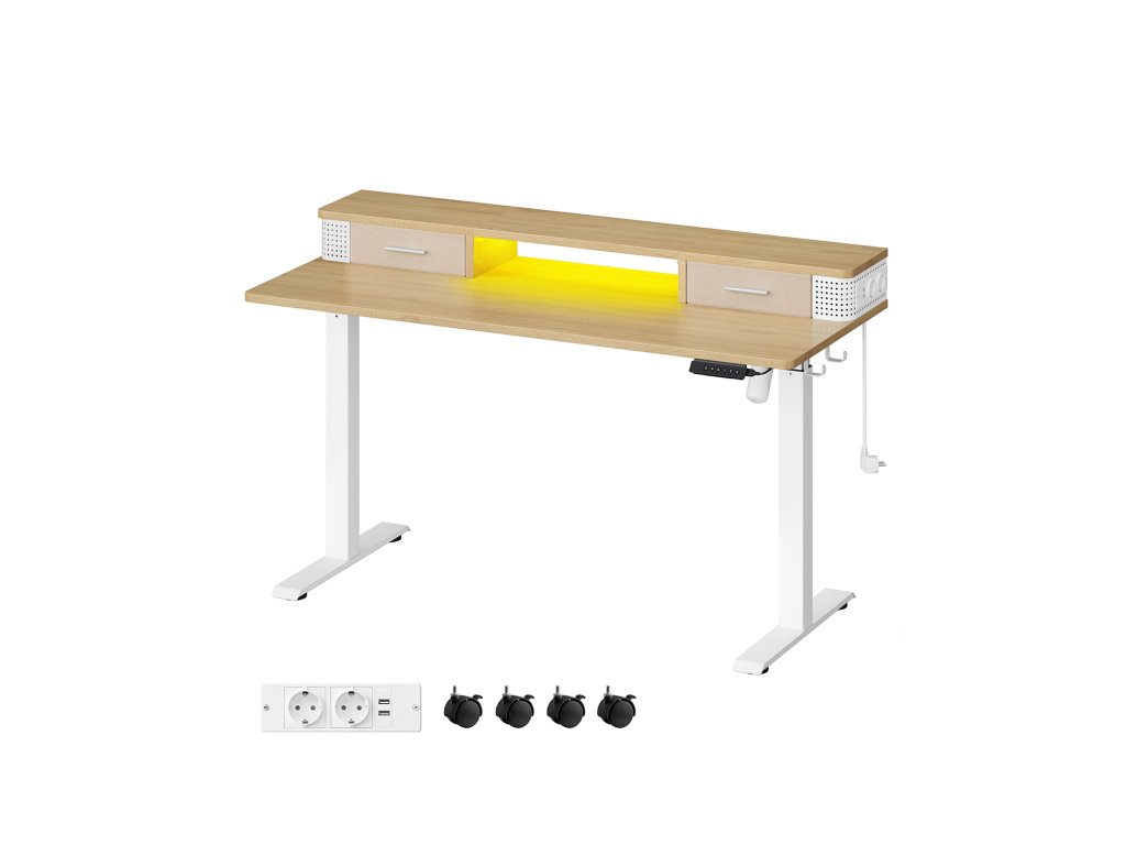 Výškově nastavitelný elektrický psací stůl, 60 x 140 x (72-120), plně nastavitelný, s podstavcem na monitor, háček, paměťová funkce, slámově žlutý.
