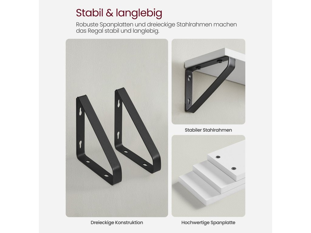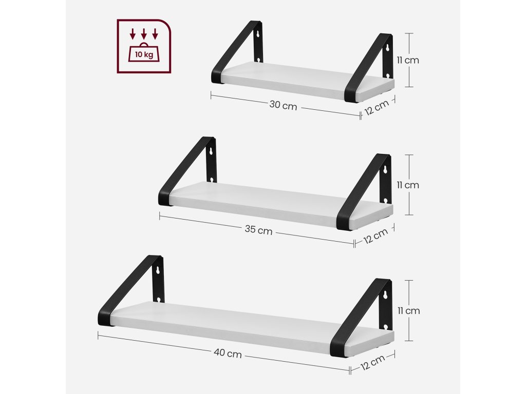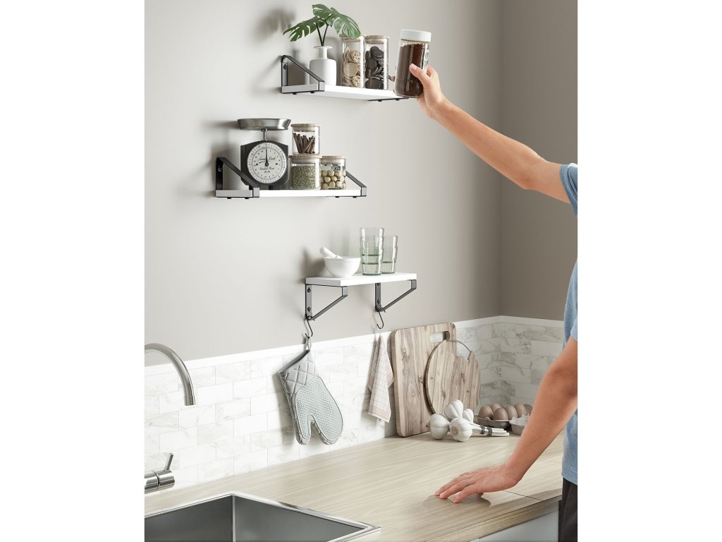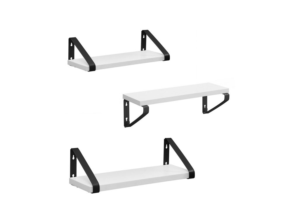 It's Showtime! Dřímají vaše dekorativní předměty stále schované v krabici? Pak bije hodina těchto 3 nástěnných polic. Dopřejte svým dekoracím čestné místo a prezentujte je stylově.Vytvoření moderní atmosféry Na tyto atraktivní plovoucí police umístěte pěkné doplňky a ponechte jim hlavní roli. Kombinace bílé police a černé konzoly dodá vašim čtyřem stěnám moderní nádech.Dobré materiály mluví samy za sebe: Robustní dřevotřískové desky a ocelové držáky zajišťují dlouhou životnost a dobrou stabilitu, i když jsou tyto police naplněny knihami, rostlinami v květináčích nebo jinými předměty. koření nebo toaletní potřebyUsnadněte si život Váš každodenní život by měl být co nejpohodlnější. Proto jsme vyvinuli tyto jednoduché plovoucí police, které lze sestavit v několika málo krocích. 2 způsoby montáže (držáky nahoře nebo dole) vám nabízejí více možností pro rozvoj vaší kreativity.Co dostanete 3 nástěnné police, které lze snadno sestavit díky označeným dílům a přiloženému návodu (čeština není zaručena). Dopřejte si tyto police a dodejte svým stěnám zvláštní dekorativní nádech.| Kategorie: | Regály a poličky |
