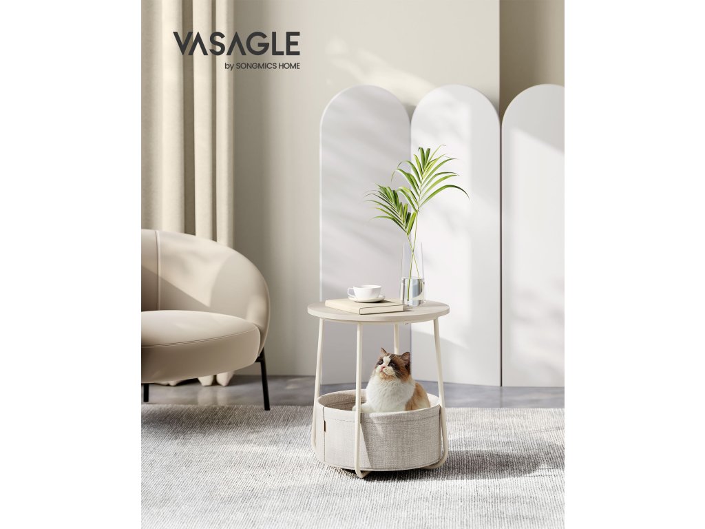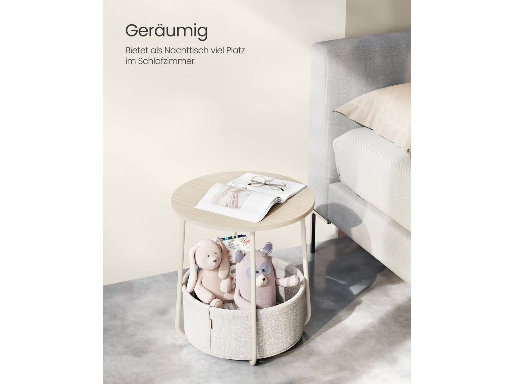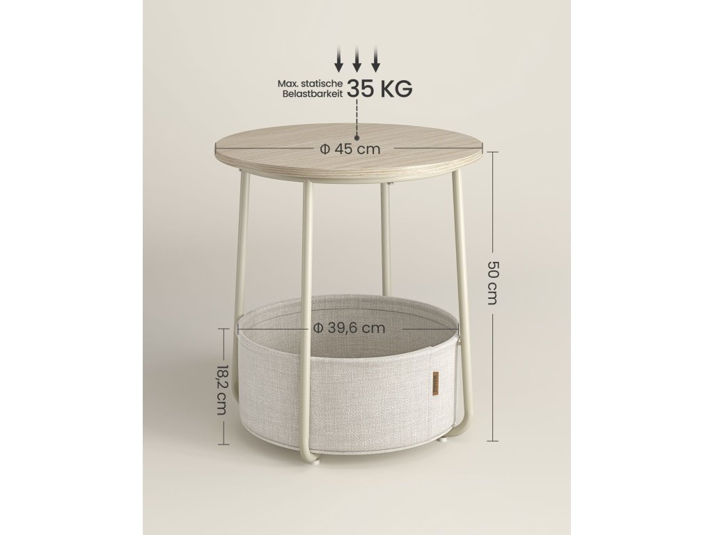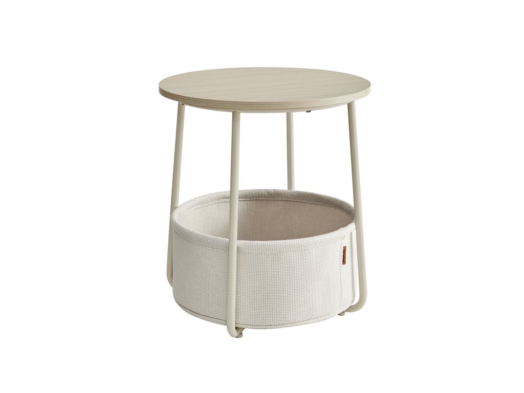 Malý kulatý konferenční stolek, odkládací stolek s látkovým košem, úložný prostor do obývacího pokoje, ložnice, noční stolek, moderní styl, krémově bílý.