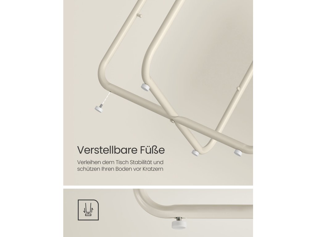 Rychlá a snadná montáž Díky jednoduché konstrukci a ilustrovanému návodu lze tento kulatý stůl sestavit za 5-10 minut.Malé prostory Tento stůl o rozměrech 45 x 50 cm (Ø x výška) a koš o rozměrech 39,5 x 18,3 cm (průměr x výška) jsou vhodné do malých prostor. Slouží jako odkládací stolek v obývacím pokoji nebo jako noční stolek v ložnici. Nabízí nový úložný prostor bez nepořádku.Robustní a stabilní Robustní dřevotřísková deska je bezpečně připevněna k rámu, nekolísá. Jednodílné ocelové nohy ve tvaru písmene U poskytují pevnou oporu. Nastavitelné nožičky zvyšují stabilitu a chrání podlahu před poškrábáním.Kvalitní koš Koš vyrobený z dvouvrstvé polyesterové tkaniny odolné proti pomačkání vypadá pěkně. Neobsahuje žádný chemický nátěr, takže je bezpečný pro použití. Díky povrchu z umělého lnu dodává tomuto konci pohovky originální nádech.Moderní a jednoduché Tento malý kulatý stolek v krémově bílé barvě s krémově bílým košem dodá vašemu obývacímu pokoji nebo ložnici originalitu. Hodí se k mnoha stylům nábytku| Kategorie: | Odkládací stolky |