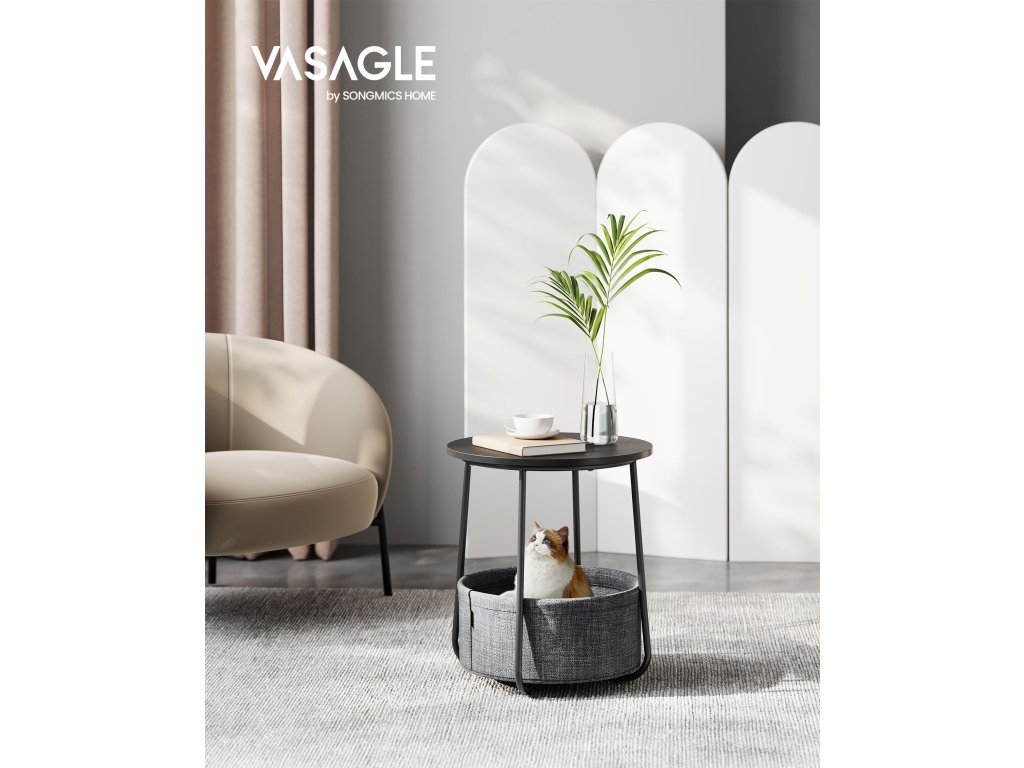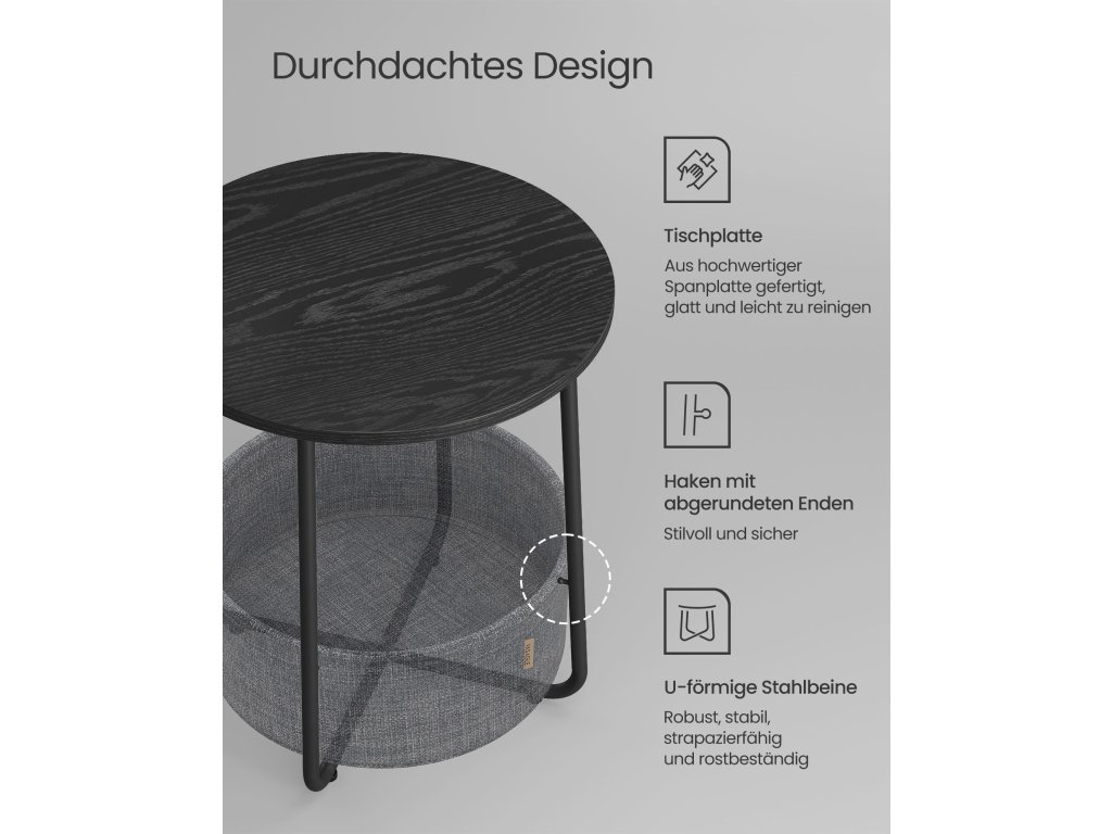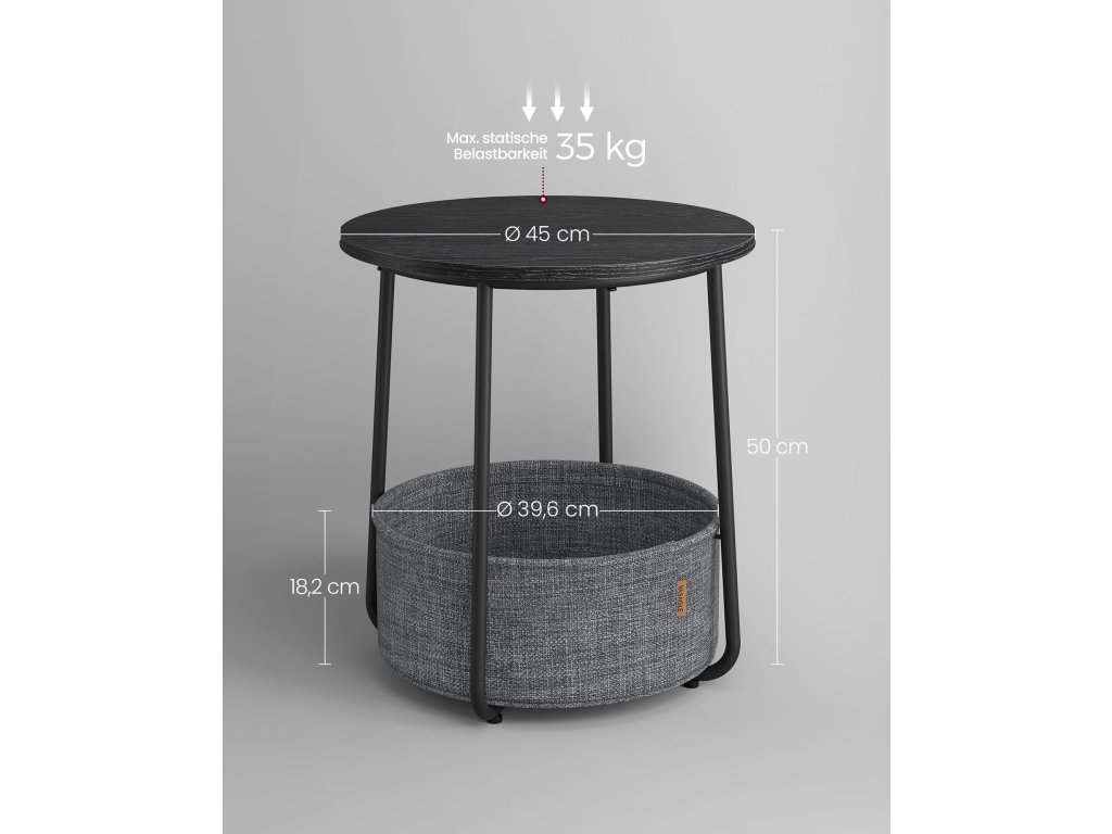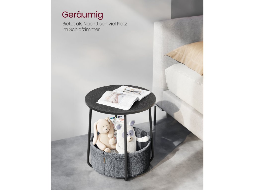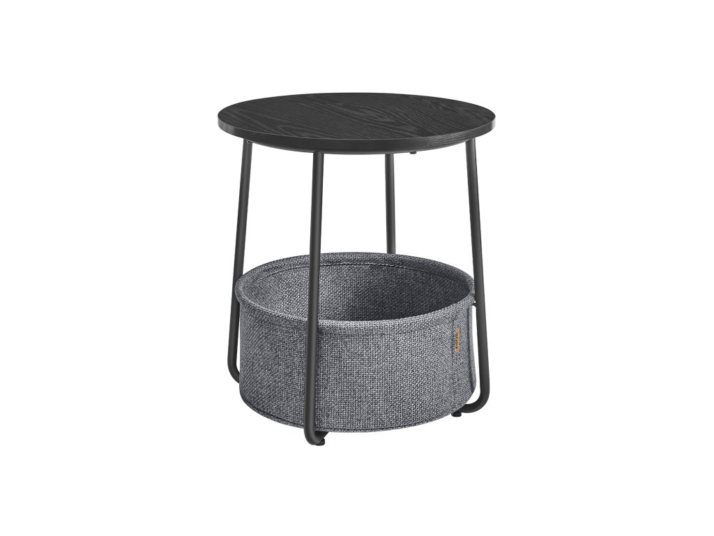 Malý kulatý noční stolek, moderní noční stolek s látkovým košem, noční stolek do obývacího pokoje, ložnice, ebenově černá a břidlicově šedá.