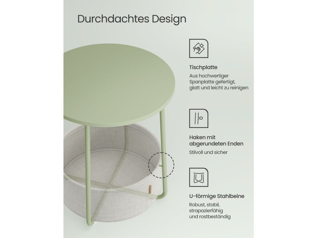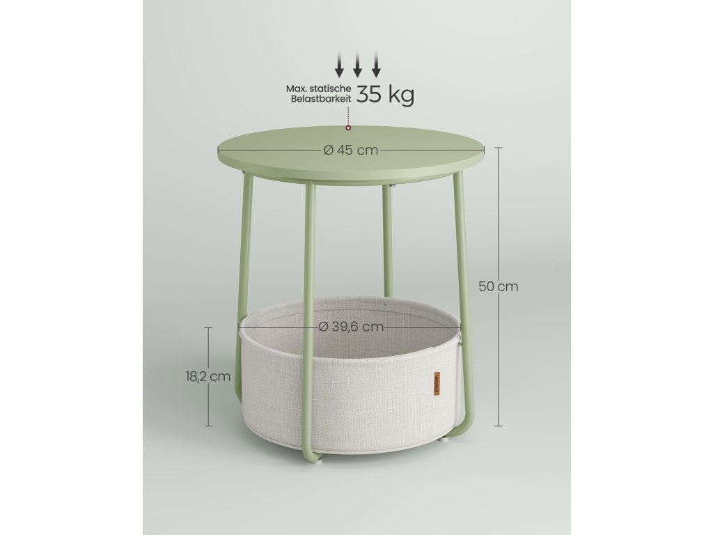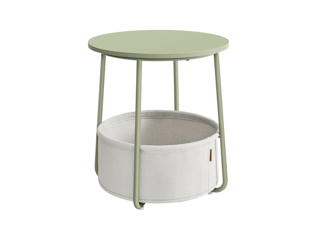 Malý kulatý noční stolek, moderní noční stolek s látkovým košem, noční stolek do obývacího pokoje ložnice, vavřínově zelená a krémově bílá.