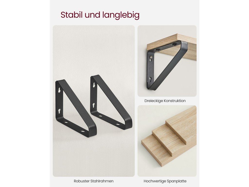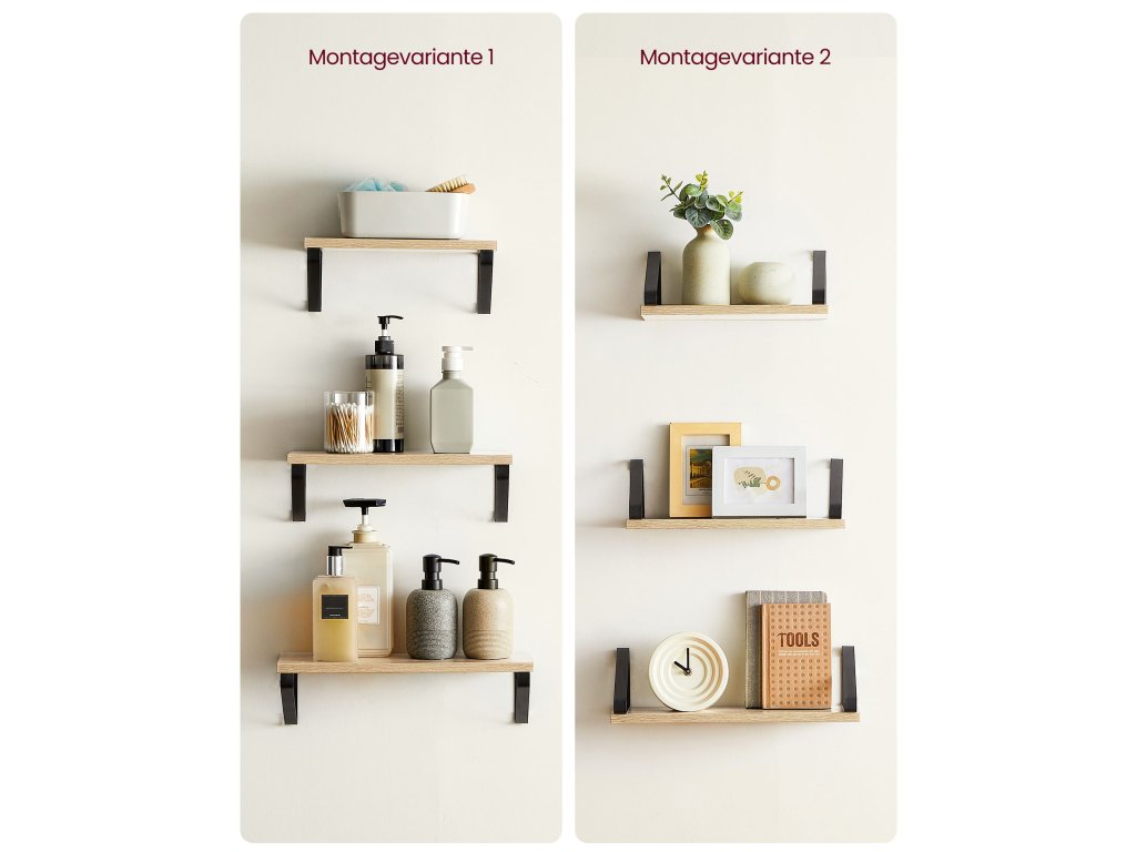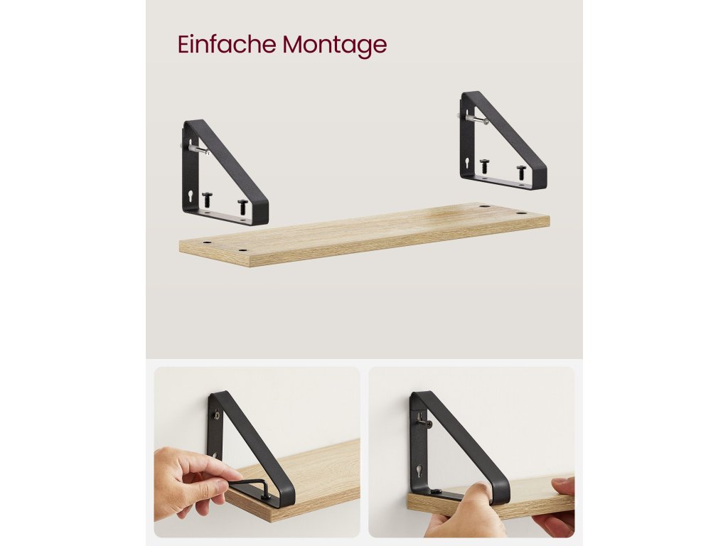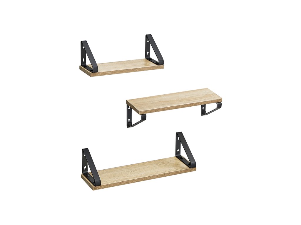 PROSTÝ, ALE STYLOVÝ Jednoduchý design, dubová police, černé ocelové konzoly - tato kombinace dodá těmto nástěnným policím a vašemu domovu charakter a zároveň krásně zvýrazní vaše dekorace. Všestranné využití: Tyto nástěnné police jsou vhodné pro vystavení vašich dekorací a rostlin v obývacím pokoji, jako police na knihy v pracovně, jako kuchyňská police na koření nebo jako koupelnová police na pečující přípravky. [2 možnosti montáže] Tyto plovoucí police můžete namontovat nahoru nebo dolů pomocí černých držáků. 2 způsoby montáže vám nabízejí více možností, jak rozvinout svou kreativitu. [Stabilní a odolné] Díky robustním trojúhelníkovým ocelovým držákům a vysoce kvalitní dřevotřískové desce jsou tyto závěsné police stabilní, odolné a každá unese až 10 kg. [Snadná montáž] Jednoduchá konstrukce, přiložený ilustrovaný návod - tyto police lze snadno namontovat na zeď.| Kategorie: | Regály a poličky |