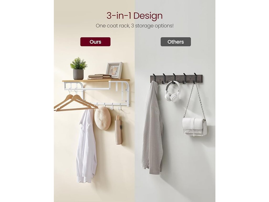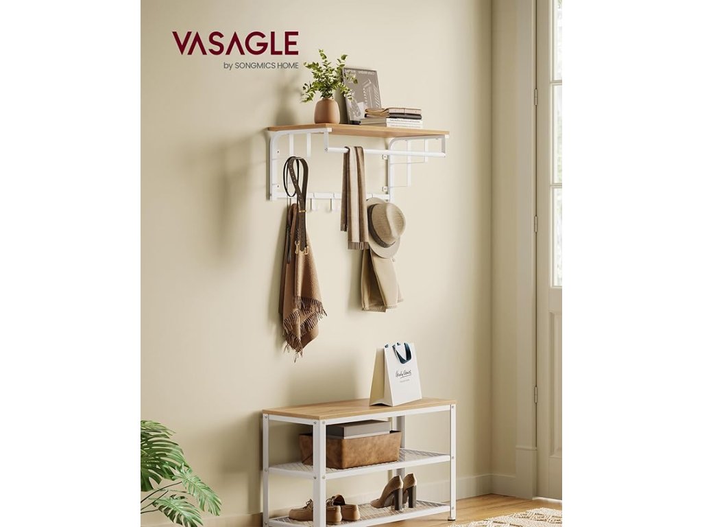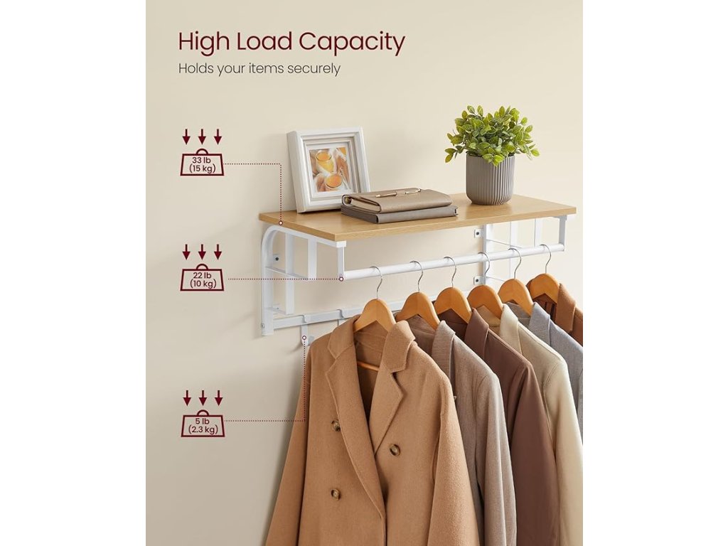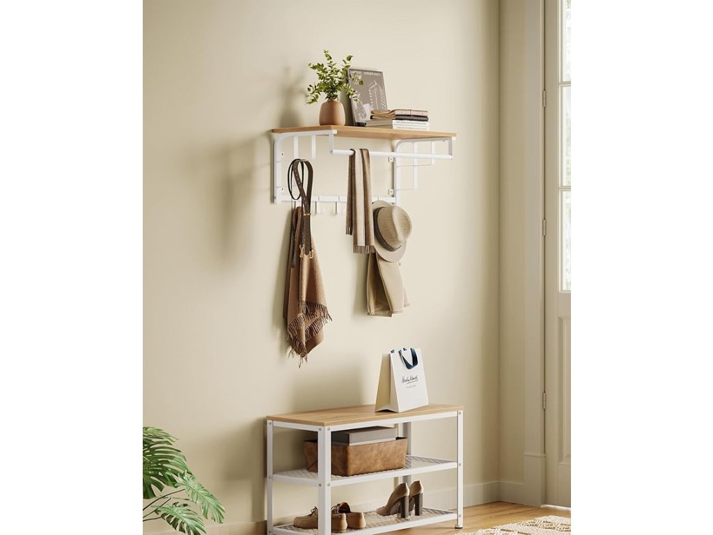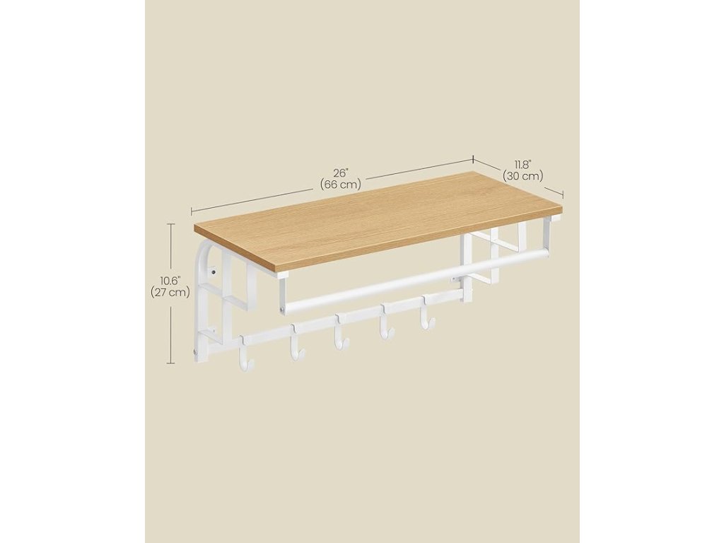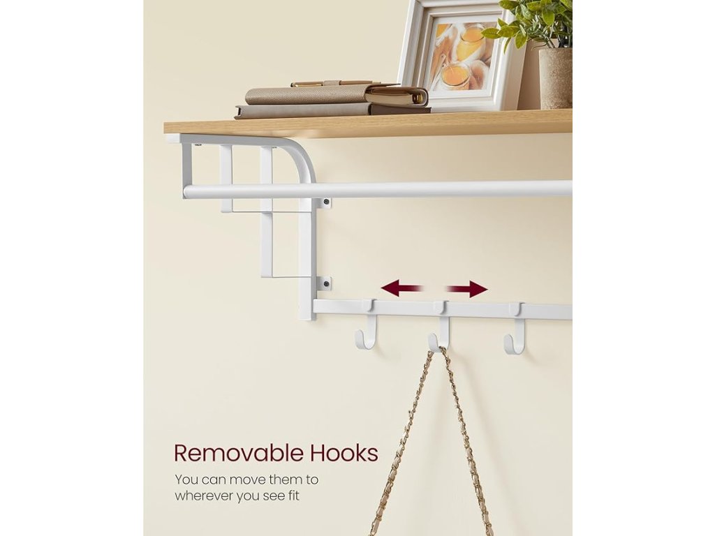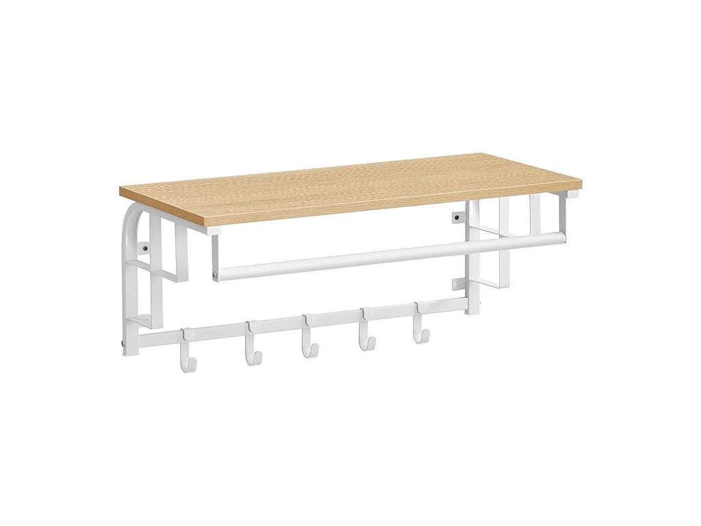 Nástěnný věšák na oděvy s 5 odnímatelnými háčky, plovoucí police se závěsnou lištou, do předsíně, ložnice, obývacího pokoje, zlatý dub a bílá barva.