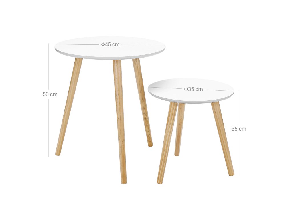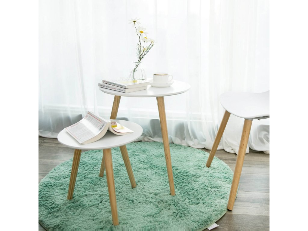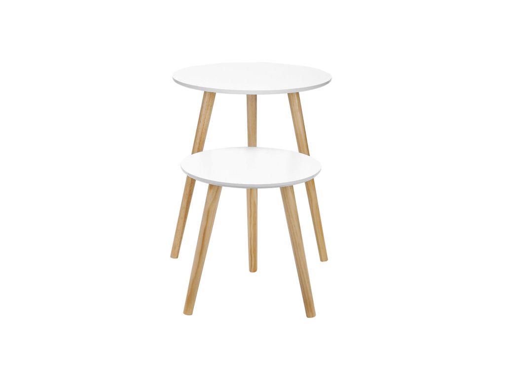Sada 2 kusů konferenčních stolků, skandinávský minimalistický konferenční stolek s nohami z masivního borovicového dřeva, bílá a přírodní.