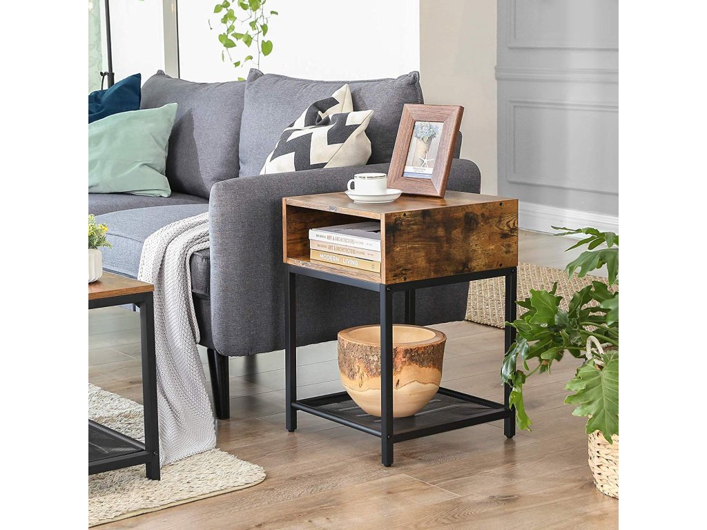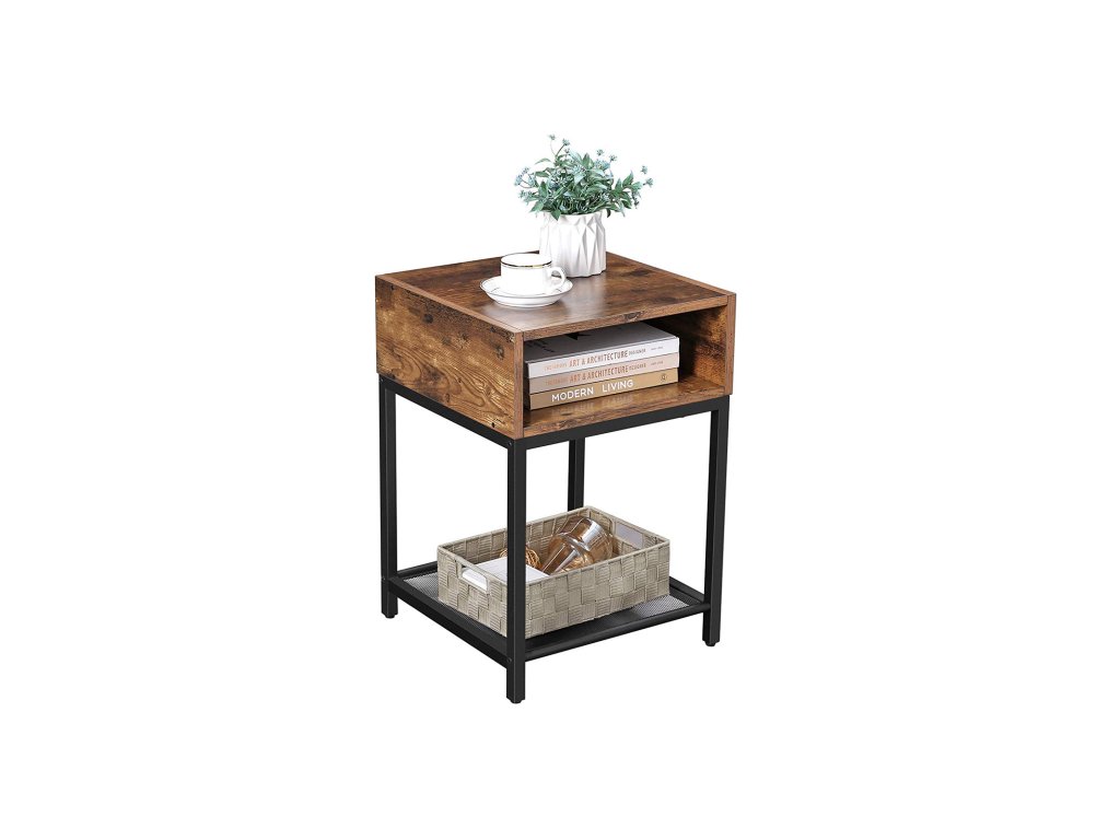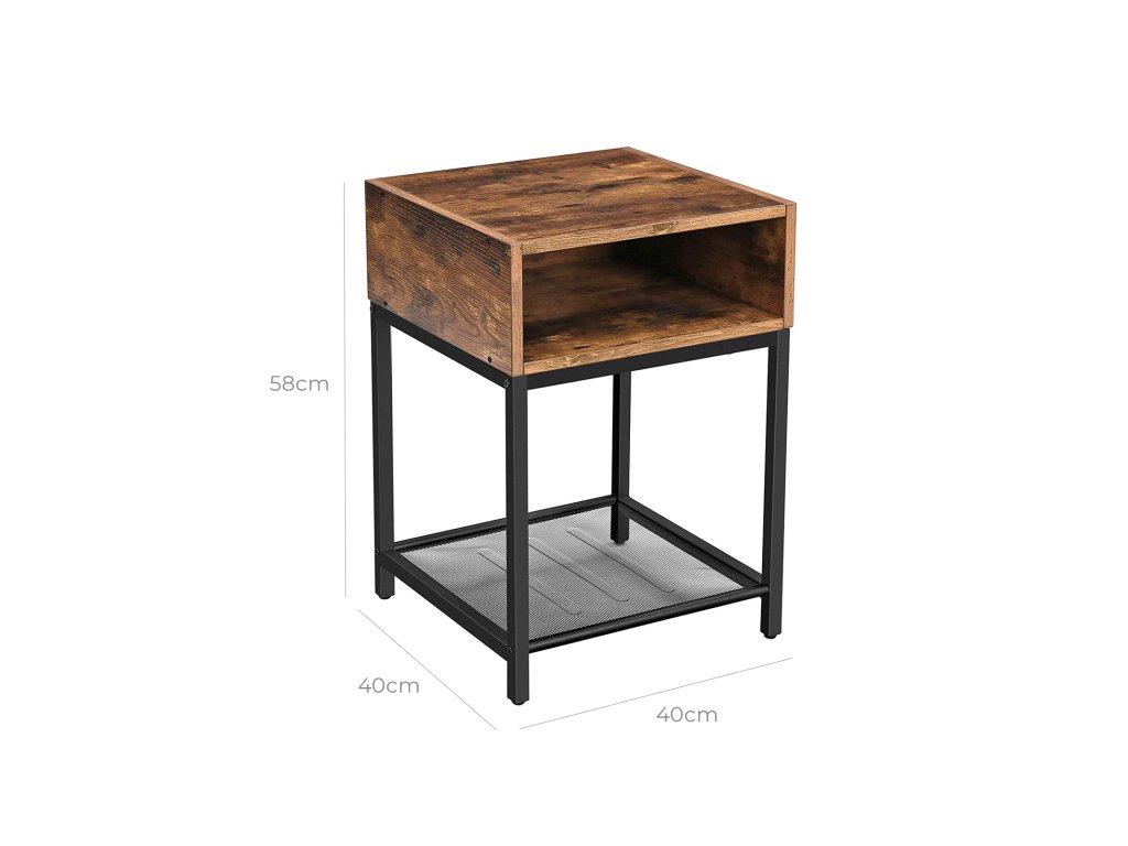 Noční stolek, boční stolek, koncový stolek s otevřenou přihrádkou a síťovanou policí, do obývacího pokoje, ložnice, snadná montáž, prostorově úsporný, industriální, rustikální hnědo-černý.