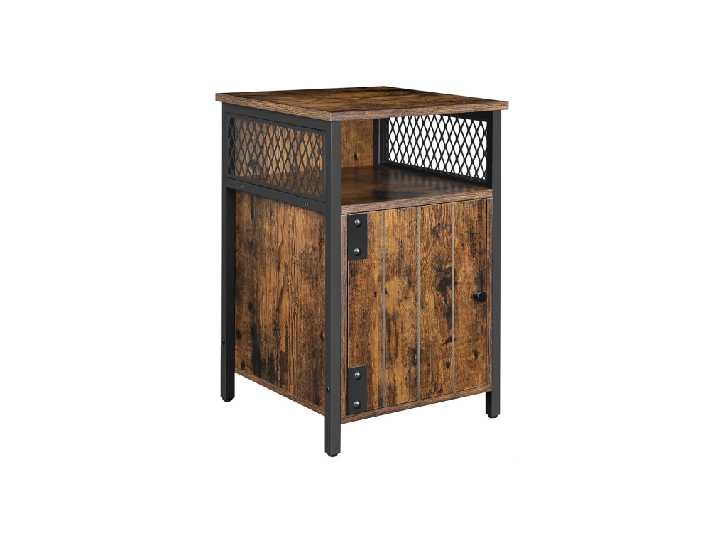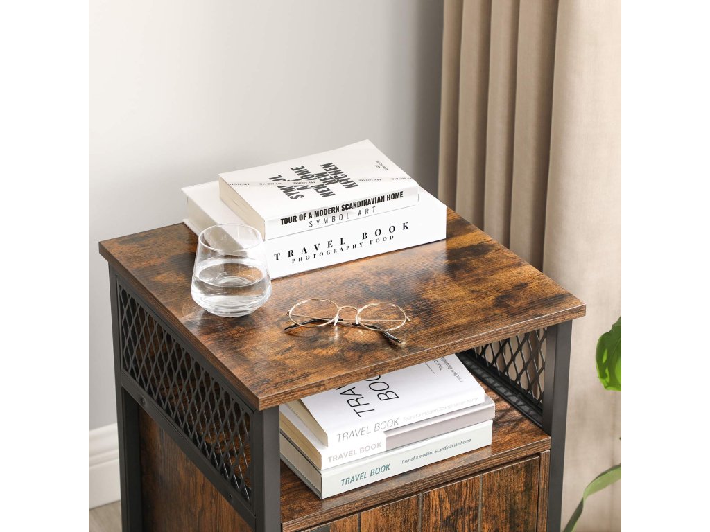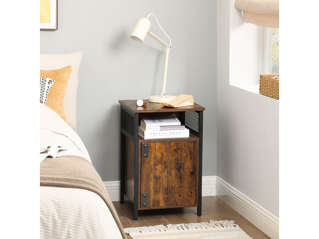 Noční stolek, odkládací stolek, 40 x 40 x 60 cm, s otevřenou policí a úložnou skříňkou, do obývacího pokoje, ložnice, průmyslový, rustikální hnědý a černý.