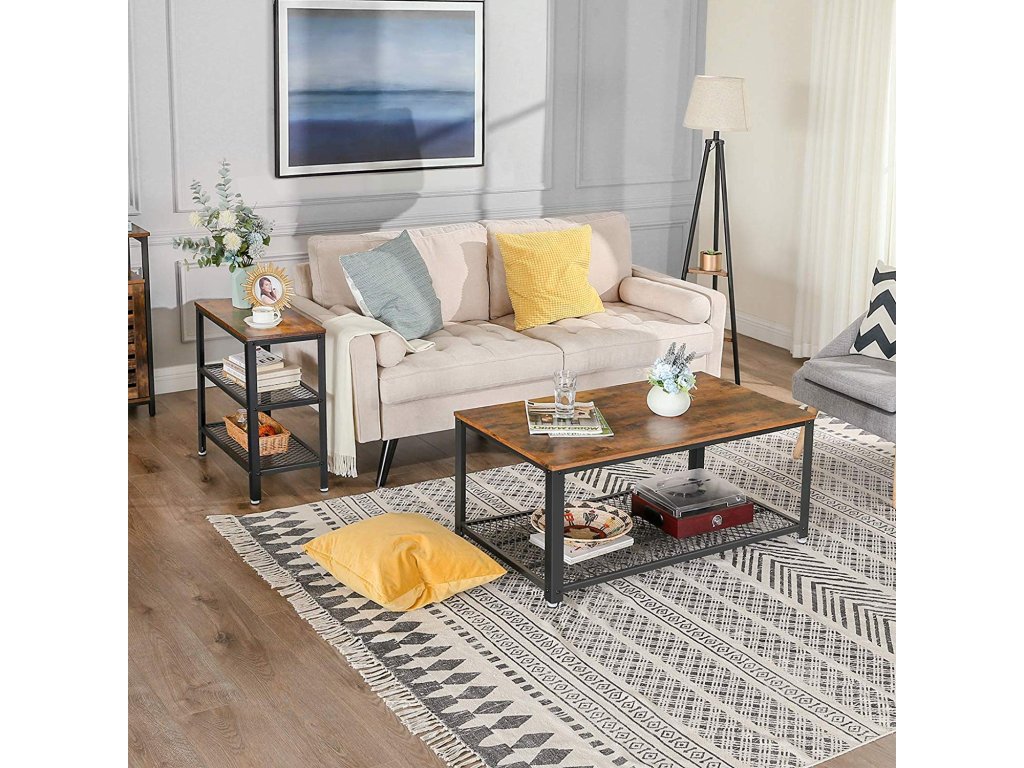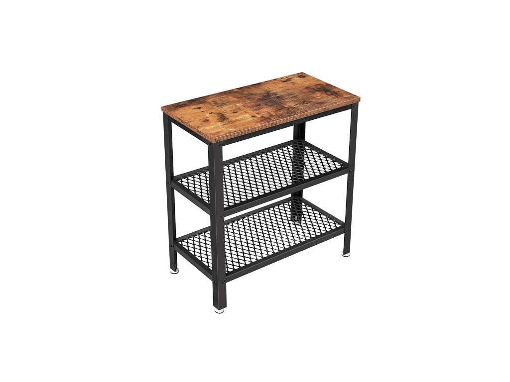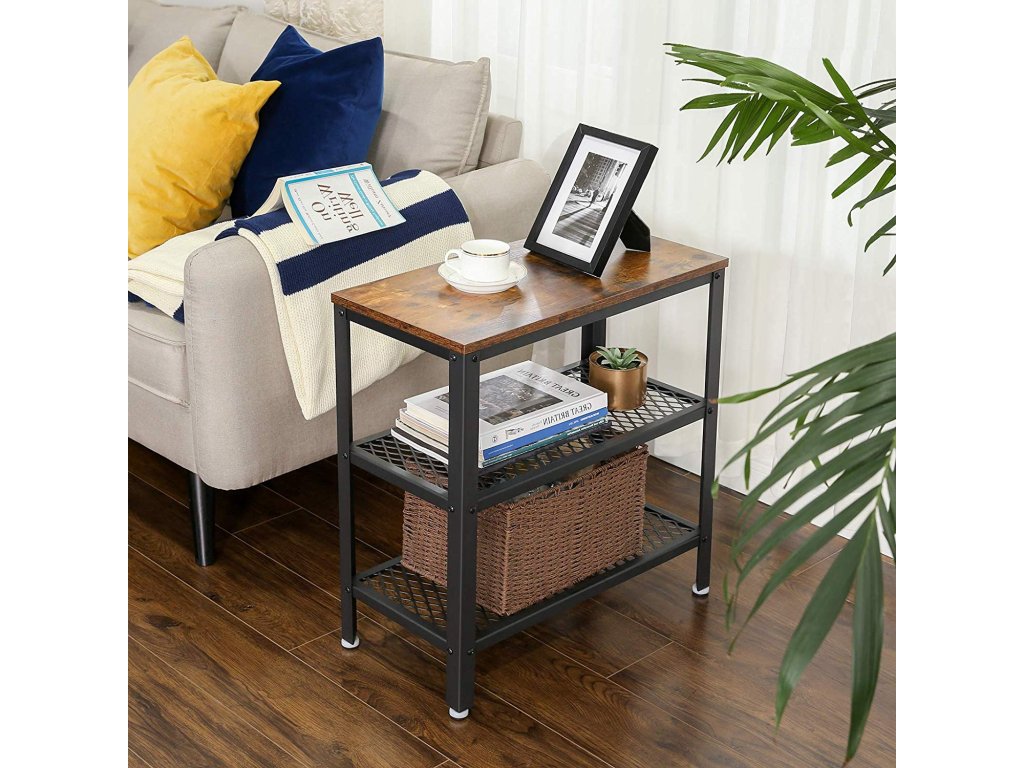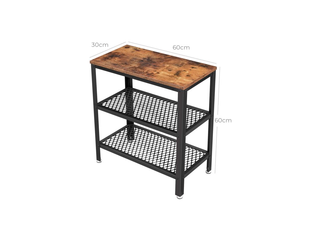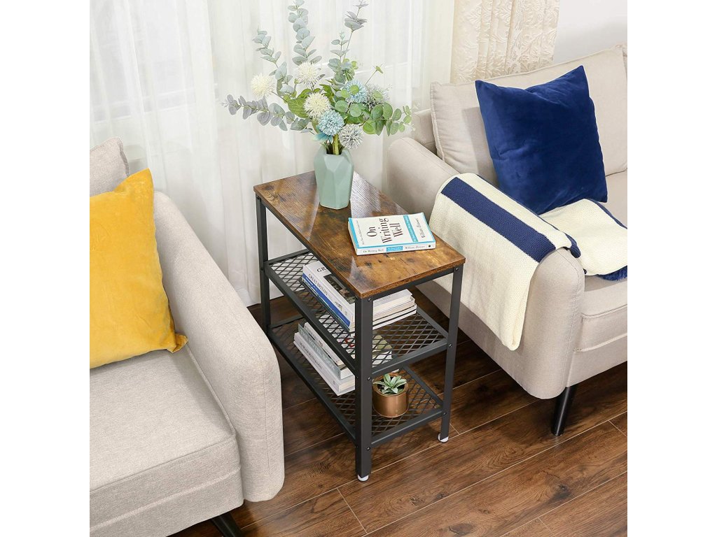 Odkládací stolek, koncový stolek, dekorativní stolek se 2 policemi ze síťoviny, předsíň, obývací pokoj, ložnice, kancelář, úzký, stabilní, šetří místo, snadná montáž, průmyslový design, rustikální hnědá.