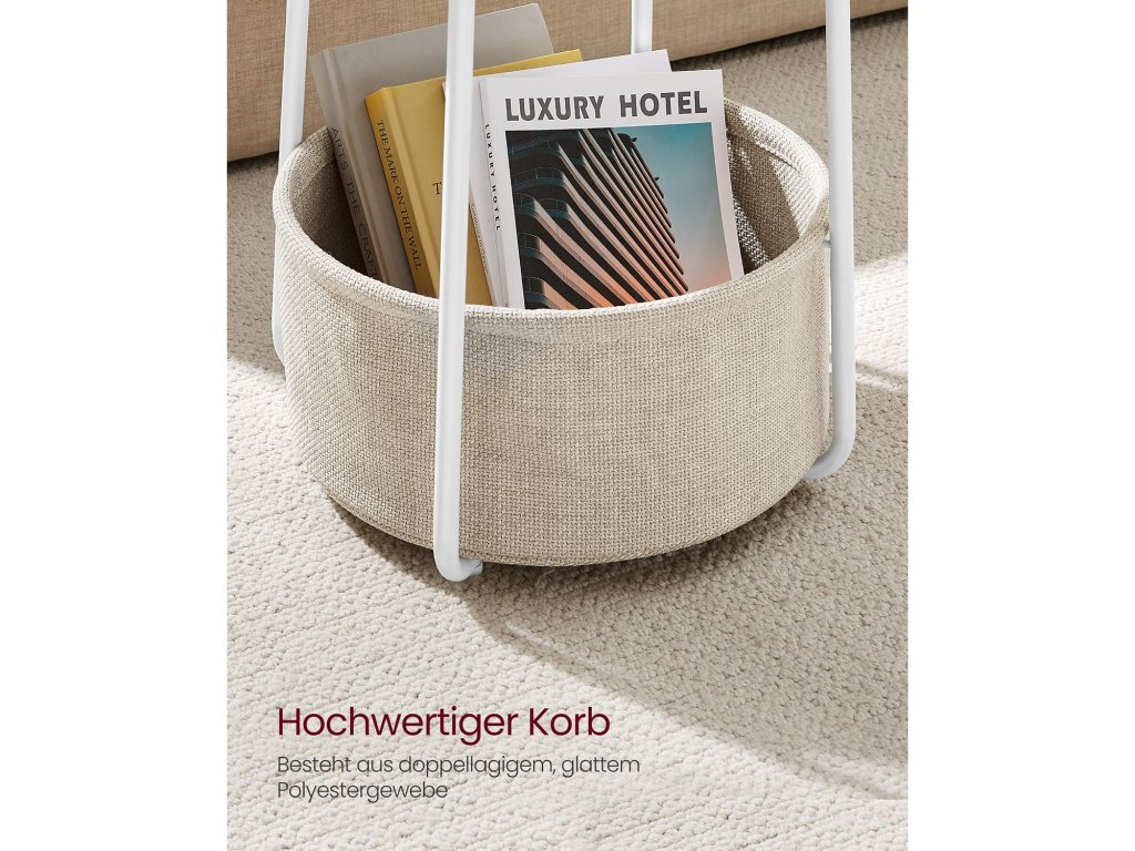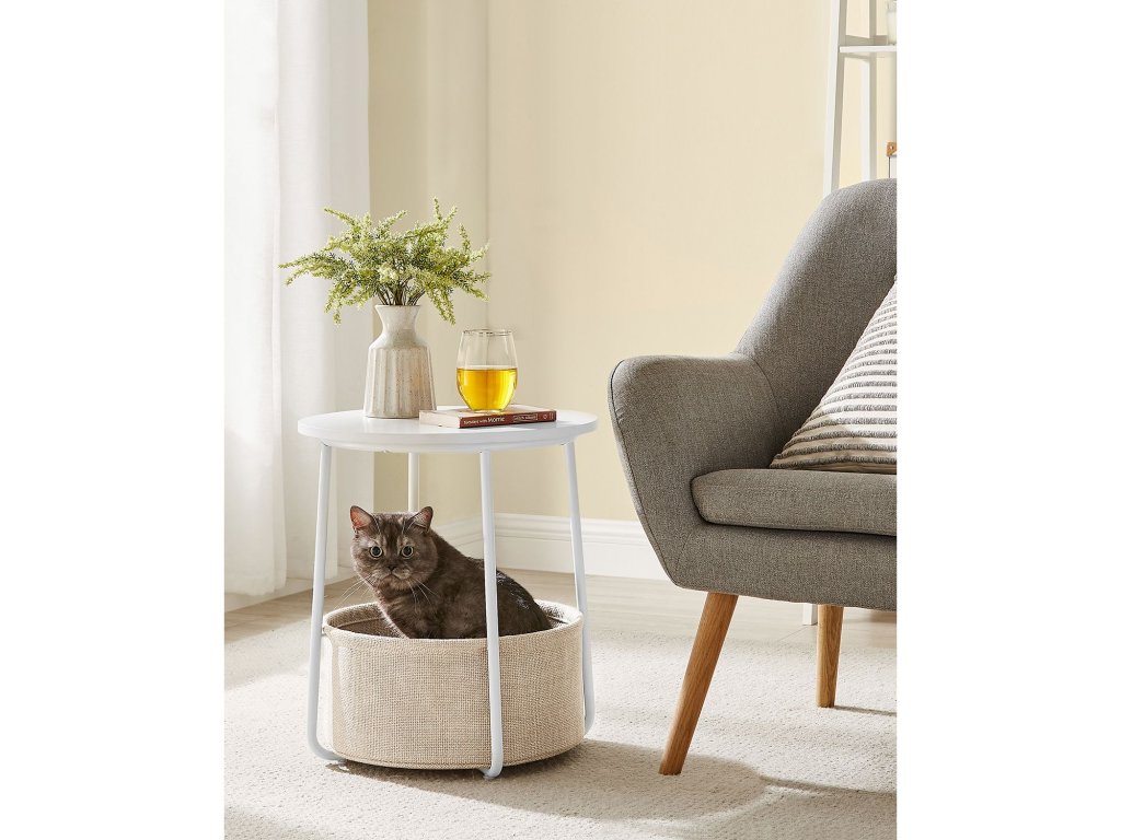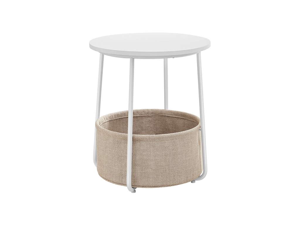 Odkládací stolek, kulatý odkládací stolek s látkovým košem, prostorný, do obývacího pokoje, ložnice, noční stolek, moderní styl, bílá a béžová.