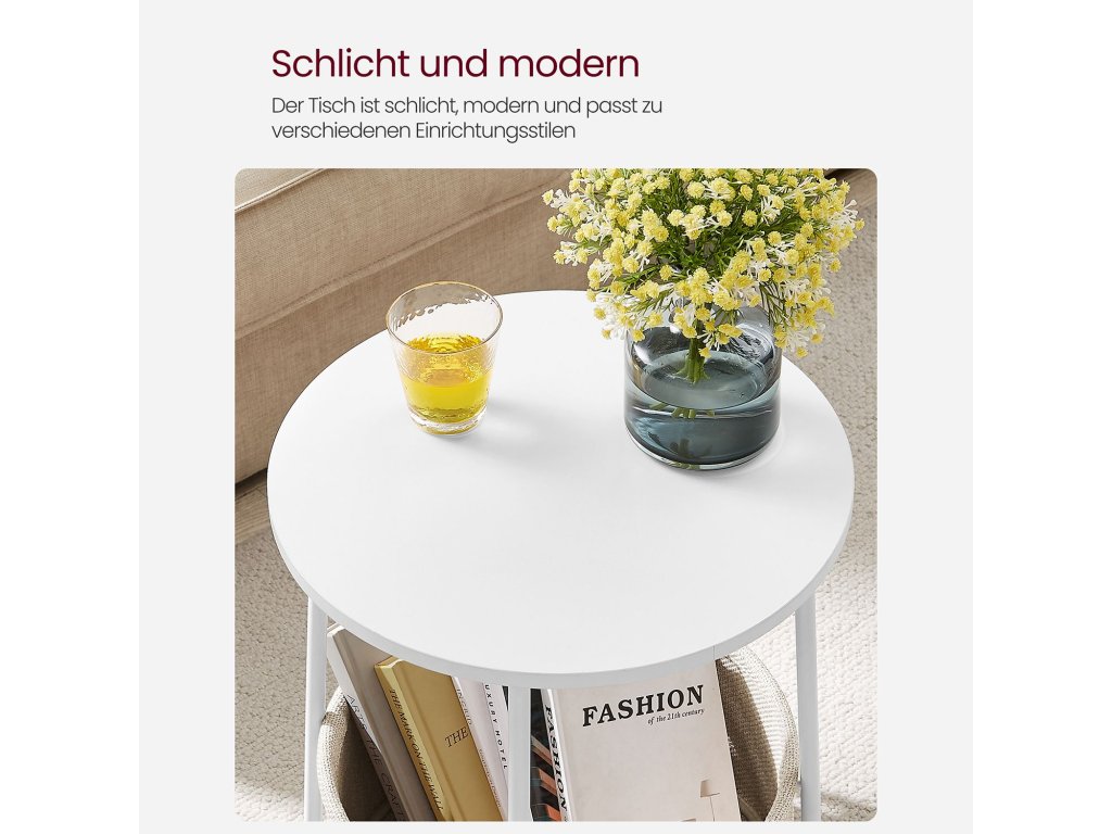 Rychlá a snadná montáž Díky jednoduché konstrukci a jasnému návodu lze tento stolek sestavit za 5-10 minut.Vhodný do malých prostor Stolek o rozměrech 45 x 50 cm (průměr x výška) s košem o rozměrech 39,6 x 18,2 cm (průměr x výška) je vhodný do malých prostor. Jako odkládací stolek v obývacím pokoji nebo jako noční stolek v ložnici není objemný, ale nabízí dostatek úložného prostoru pro vaše věci.Robustní a stabilní Robustní deska z dřevotřísky je připevněna k rámu, aniž by se kývala. Jednodílné ocelové nohy ve tvaru písmene U poskytují pevnou oporu. Nastavitelné nožičky zvyšují stabilitu a nepoškrábou podlahu.Kvalitní koš Dvouvrstvý koš z nemačkavé polyesterové tkaniny je příjemný na pohled a neobsahuje chemické látky pro bezpečné používání. Svým vzhledem připomínajícím plátno dodává tomuto malému stolku jedinečný nádech.Moderní a jednoduchý Tento jednoduchý bílý kulatý konferenční stolek s béžovým košem dodá vašemu obývacímu pokoji nebo ložnici styl a snadno ho sladíte s různými styly nábytku.| Kategorie: | Odkládací stolky |