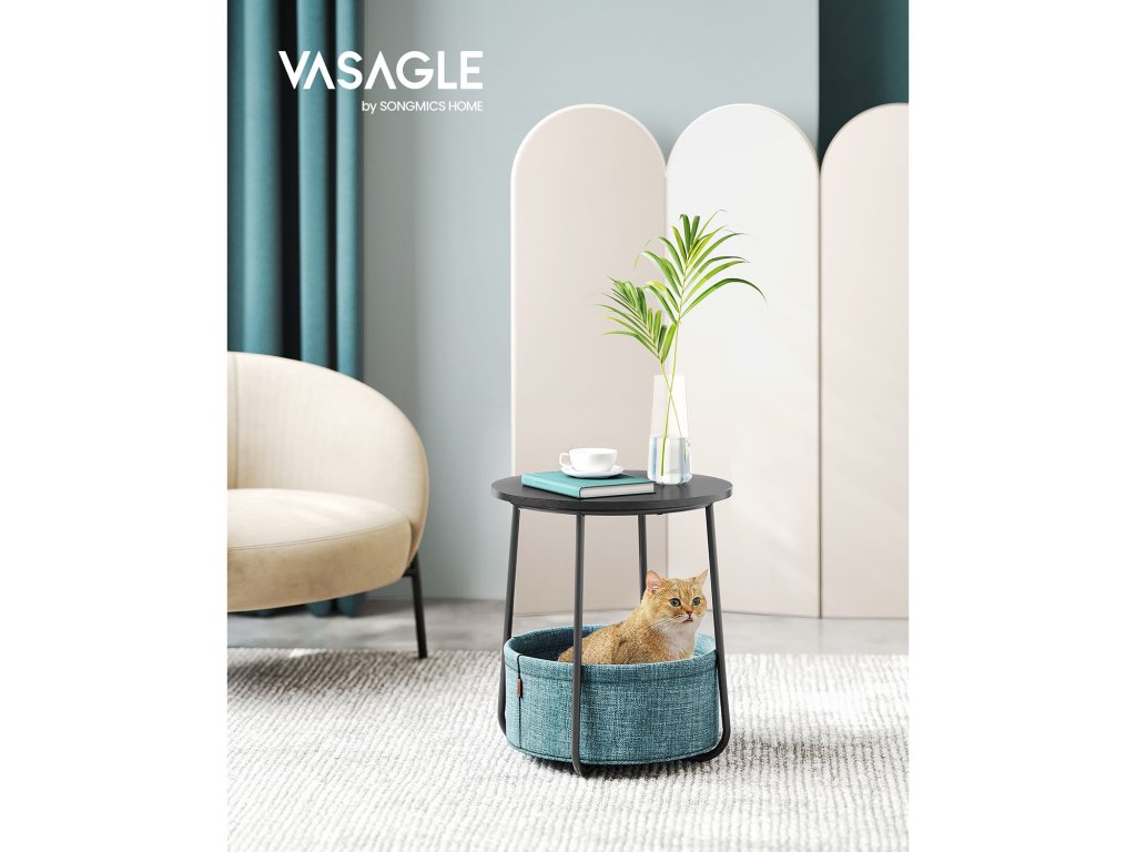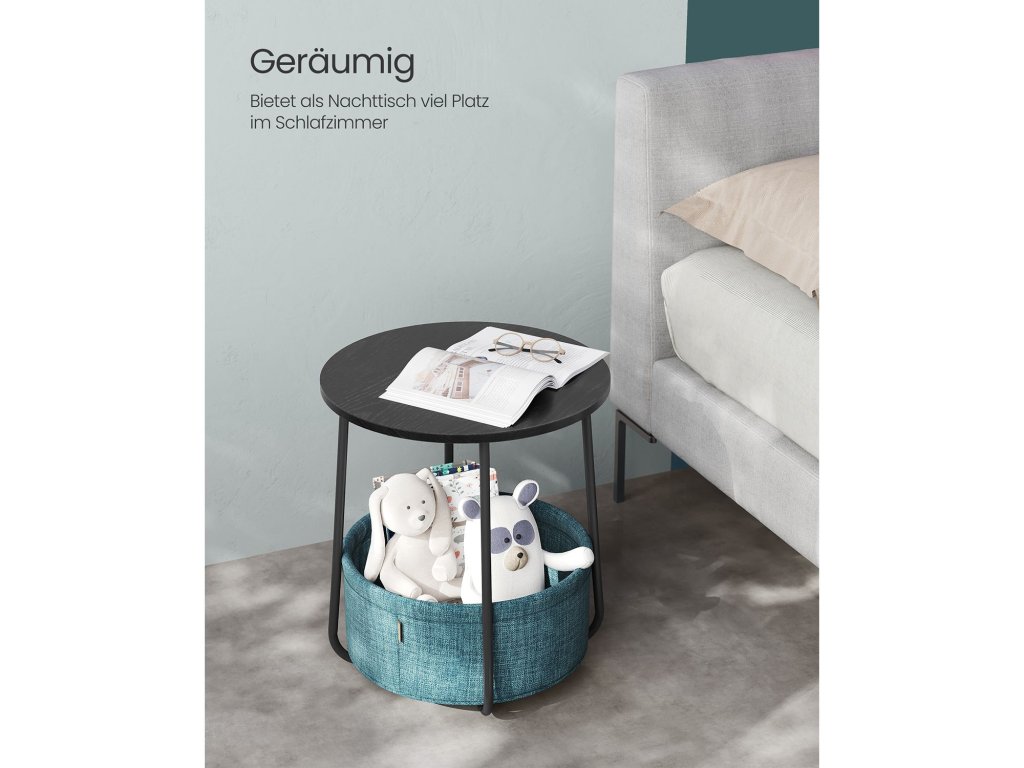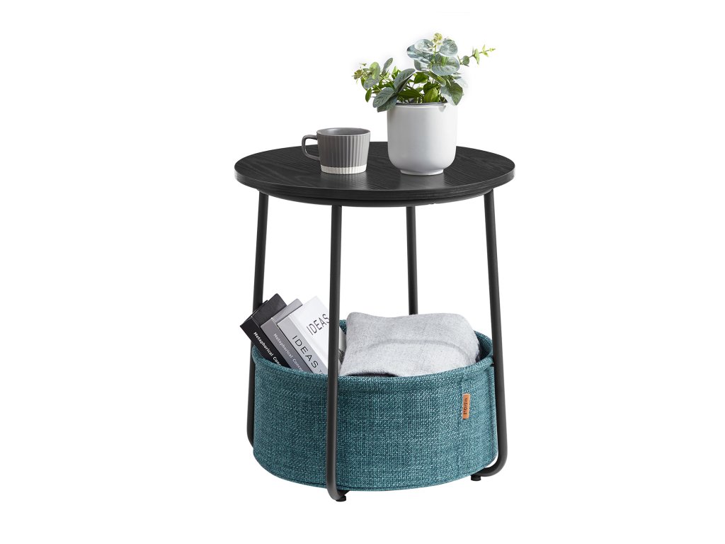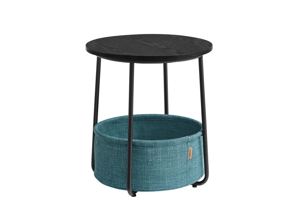 Odkládací stolek, kulatý odkládací stolek s látkovým košem, prostorný, do obývacího pokoje, ložnice, noční stolek, moderní styl, černý s dřevěnou strukturou a tmavě tyrkysovou.