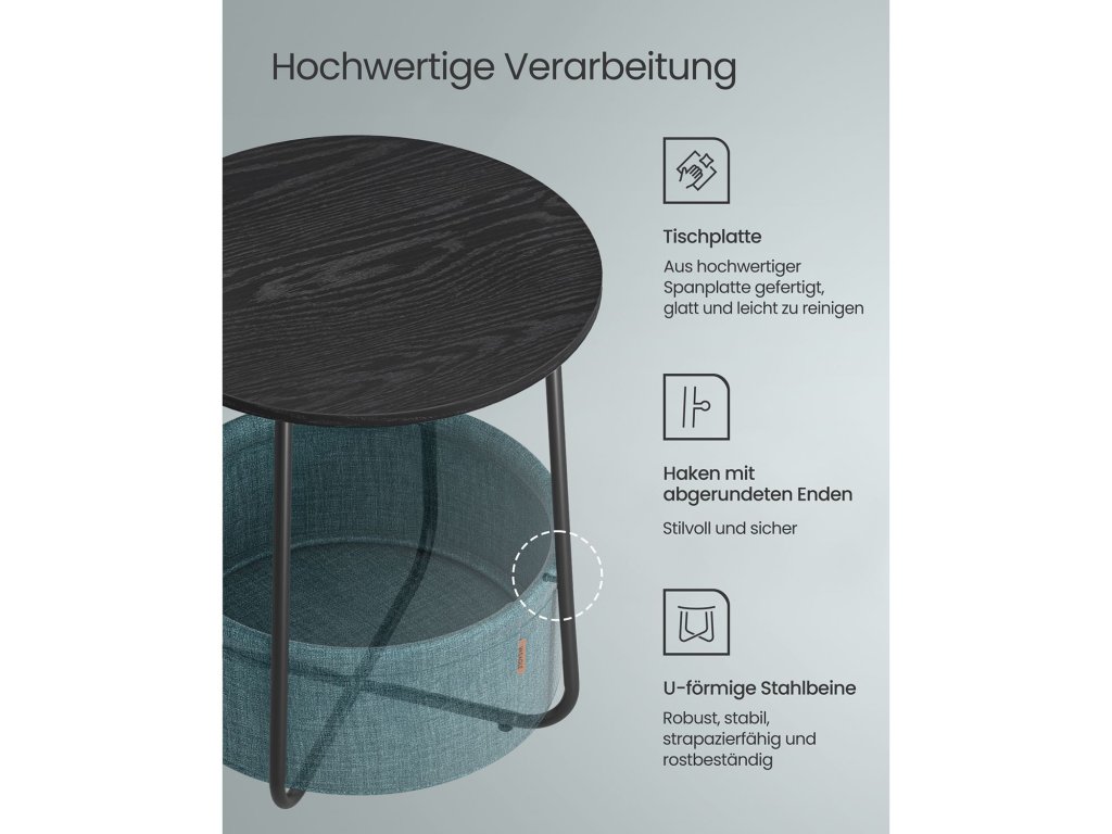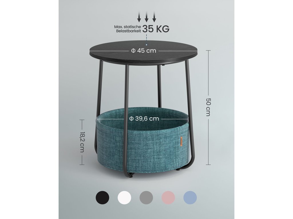 Rychlá a snadná montáž Díky jednoduché konstrukci a jasnému návodu lze tento stolek sestavit za 5-10 minut.Vhodný do malých prostor Stolek o rozměrech 45 x 50 cm (průměr x výška) s košem o rozměrech 39,6 x 18,2 cm (průměr x výška) je vhodný do malých prostor. Jako odkládací stolek v obývacím pokoji nebo jako noční stolek v ložnici není objemný, ale nabízí dostatek úložného prostoru pro vaše věci.Robustní a stabilní Robustní deska z dřevotřísky je připevněna k rámu, aniž by se kývala. Jednodílné ocelové nohy ve tvaru písmene U poskytují pevnou oporu. Nastavitelné nožičky zvyšují stabilitu a nepoškrábou podlahu.Kvalitní koš Dvouvrstvý koš z nemačkavé polyesterové tkaniny je příjemný na pohled a neobsahuje chemické látky pro bezpečné používání. Svým vzhledem připomínajícím plátno dodává tomuto malému stolku jedinečný nádech.Moderní a jednoduché Tento jednoduchý černý kulatý konferenční stolek s dřevěnou strukturou a tmavě tyrkysovým košem dodá vašemu obývacímu pokoji nebo ložnici styl a snadno ho sladíte s různými doplňky. stylů nábytku| Kategorie: | Odkládací stolky |