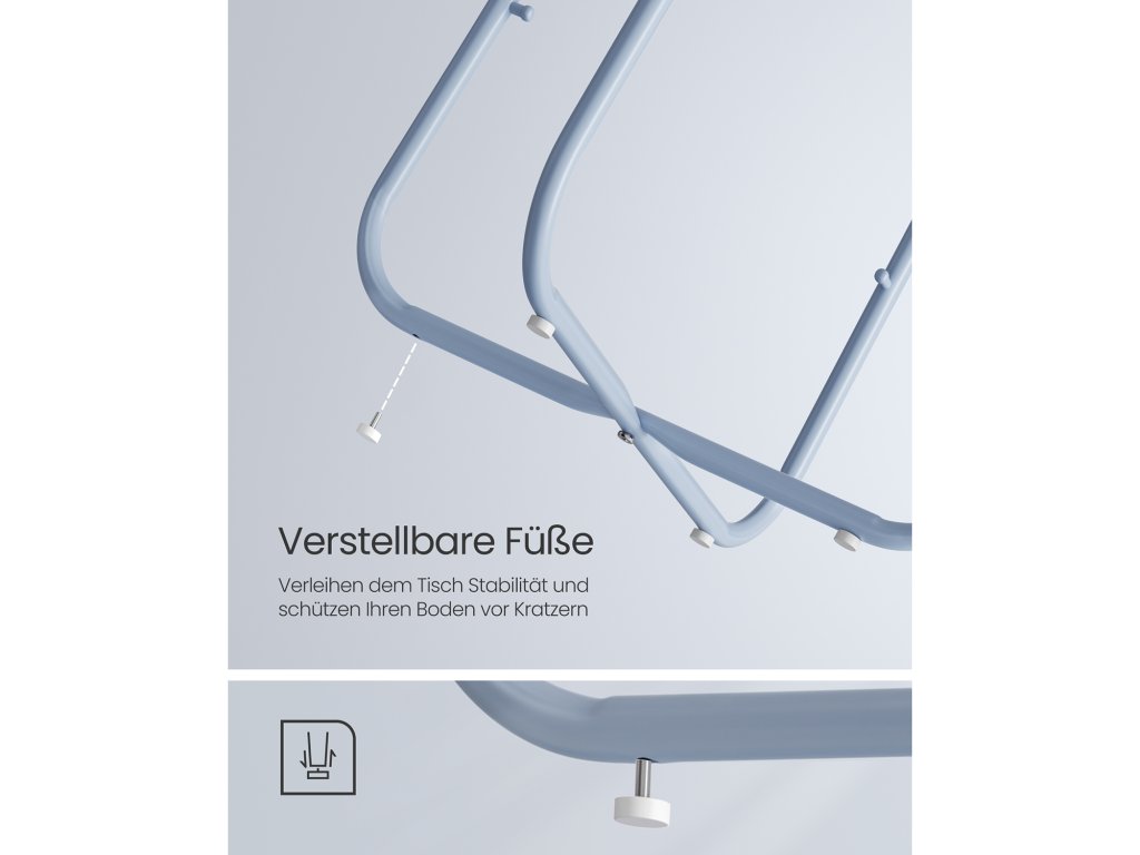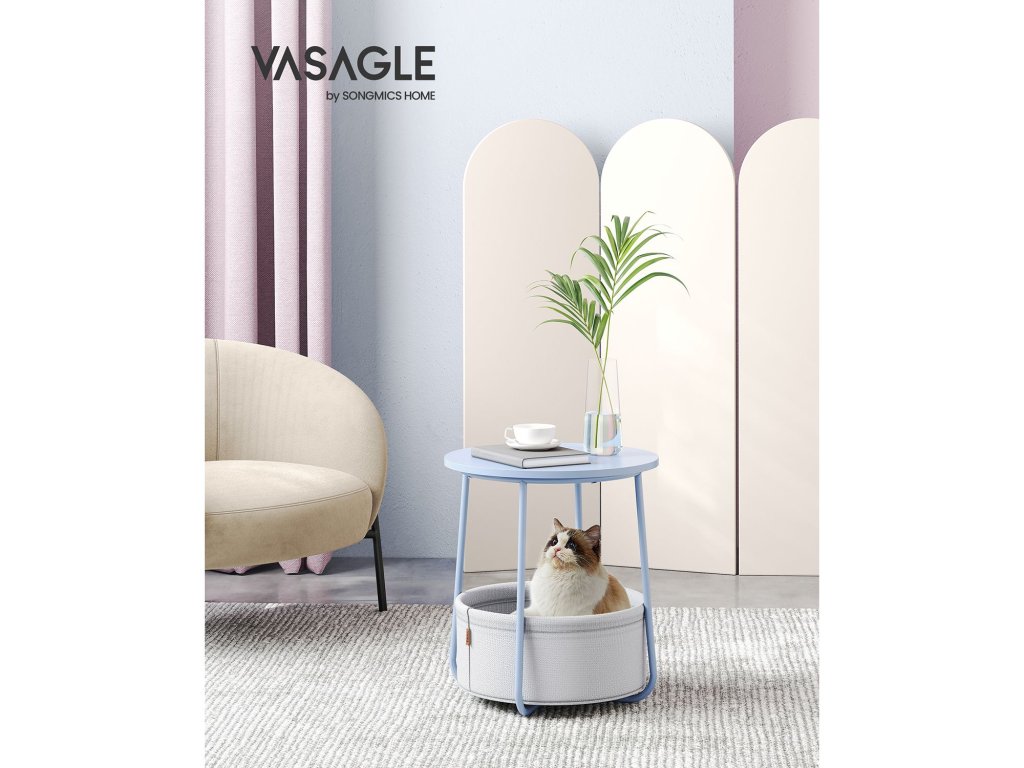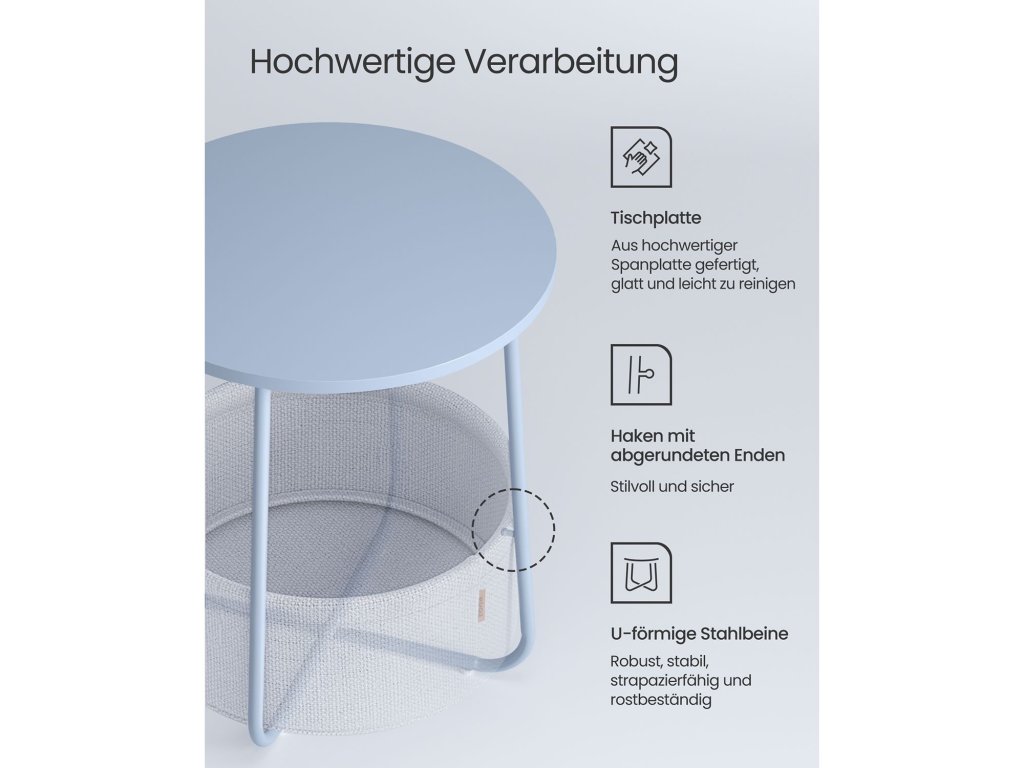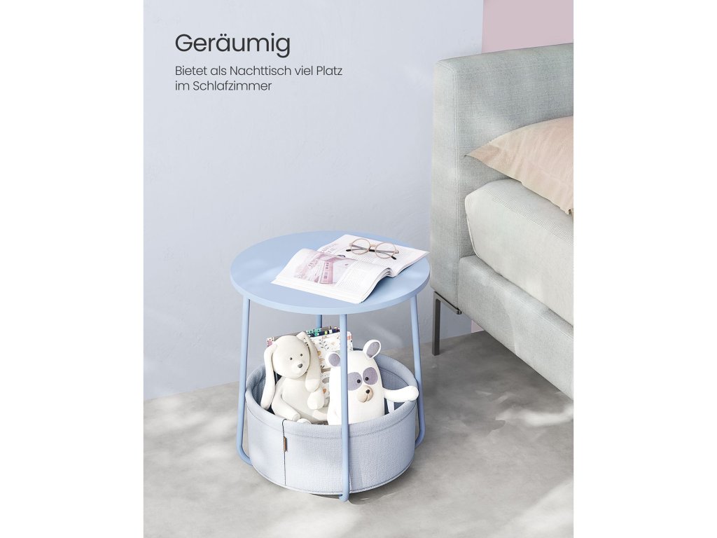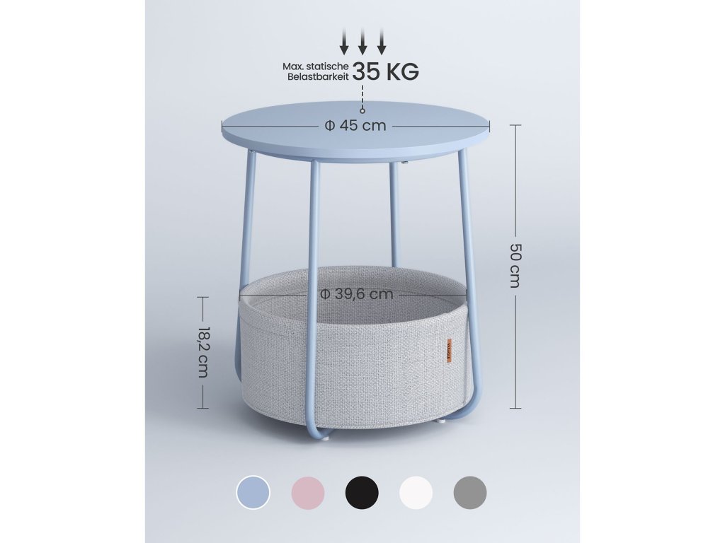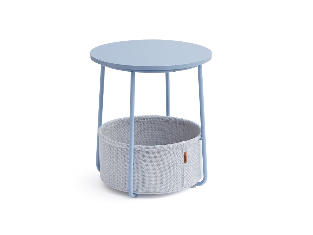 Odkládací stolek, kulatý odkládací stolek s látkovým košem, prostorný, do obývacího pokoje, ložnice, noční stolek, moderní styl, pudrově modrá a pastelově modrá.