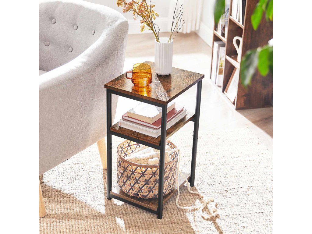 Odkládací stolek, noční stolek, koncový stolek se 2 úložnými policemi, štíhlý vysoký stolek, ocelový rám, do obývacího pokoje, obývacího pokoje, ložnice, průmyslový, rustikální hnědý a černý.