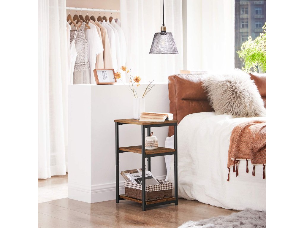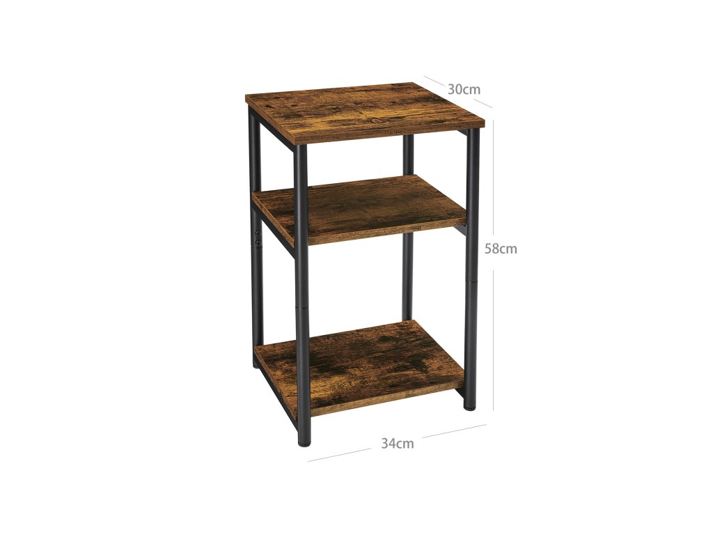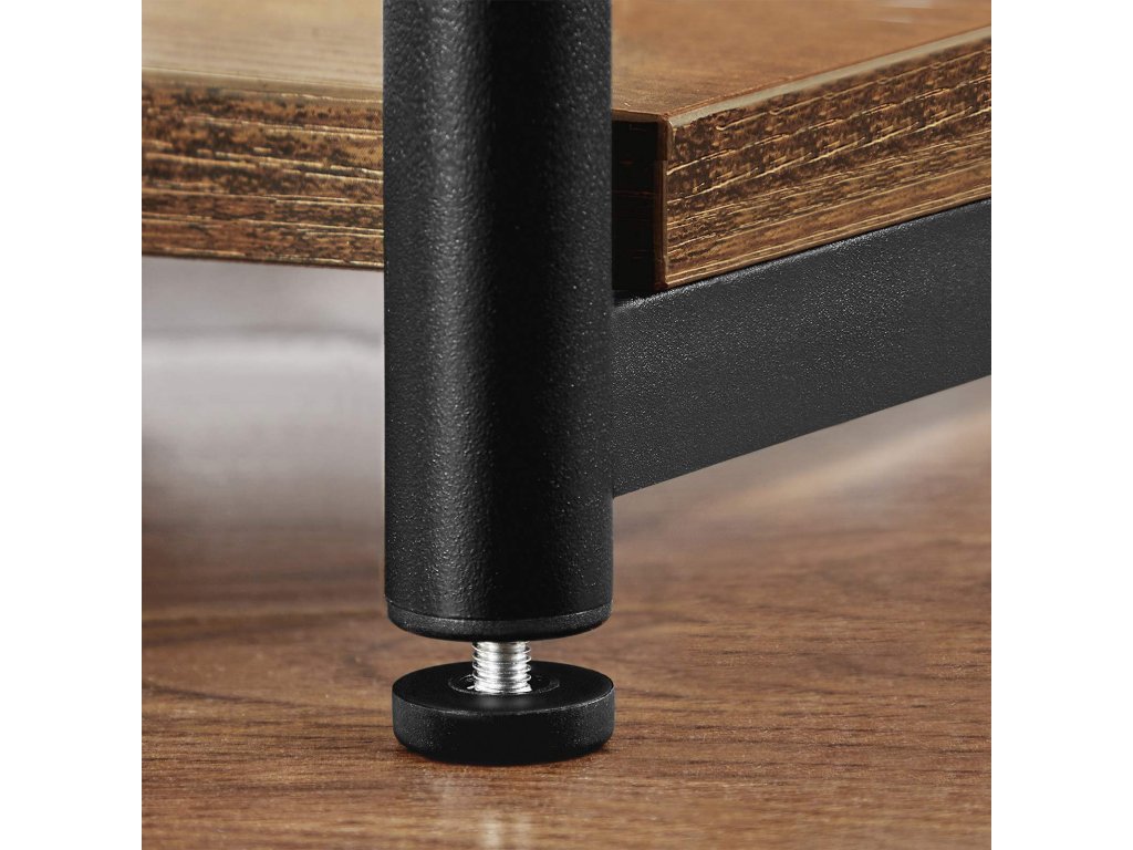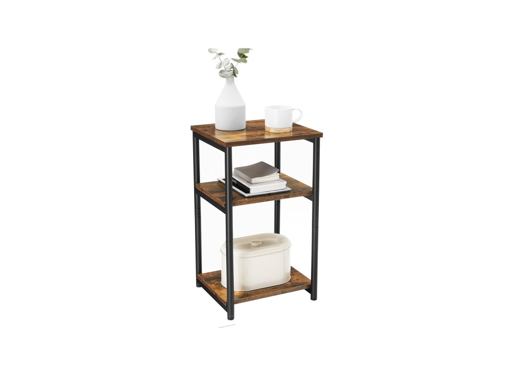 Jasné linie a atraktivita: 3 obdélníkové desky v rustikální hnědé barvě jsou orámovány kulatými nohami v matné černé barvě a společně tvoří tento jednoduchý odkládací stolek, který vyzařuje industriální atmosféru a přitahuje pozornost. v jakékoli místnostiÚsporný a přitom prostorný: tento noční stolek o rozměrech 34 x 30 x 58 cm nezabírá mnoho místa a slouží jako dobrá odkládací pomůcka se 3 policemi - v horní části je umístěn hrnek. košík ve spodní části a uprostřed tabletu.Dobře vyrobený a vyvážený: díky dřevotřískové desce, kterou drží ocelový rám, je tento stůl pevný a stabilní. Každé patro unese až 20 kg. Nastavitelné nožičky také zabraňují nepříjemnému kývání na nerovných podlahách.Jednoduchá montáž krok za krokem: díky jednoduchému rámu, označeným dílům a srozumitelnému návodu (čeština není zaručena) je montáž provedena v pouhých 4 krocích a zabere málo času. Nyní si vezměte občerstvení na útulný filmový večer!CO ZÍSKÁTE: Příruční stolek v industriálním stylu se 3 otevřenými policemi pro praktičtější úložný prostor, který funguje jako příruční i noční stolek.| Kategorie: | Odkládací stolky |